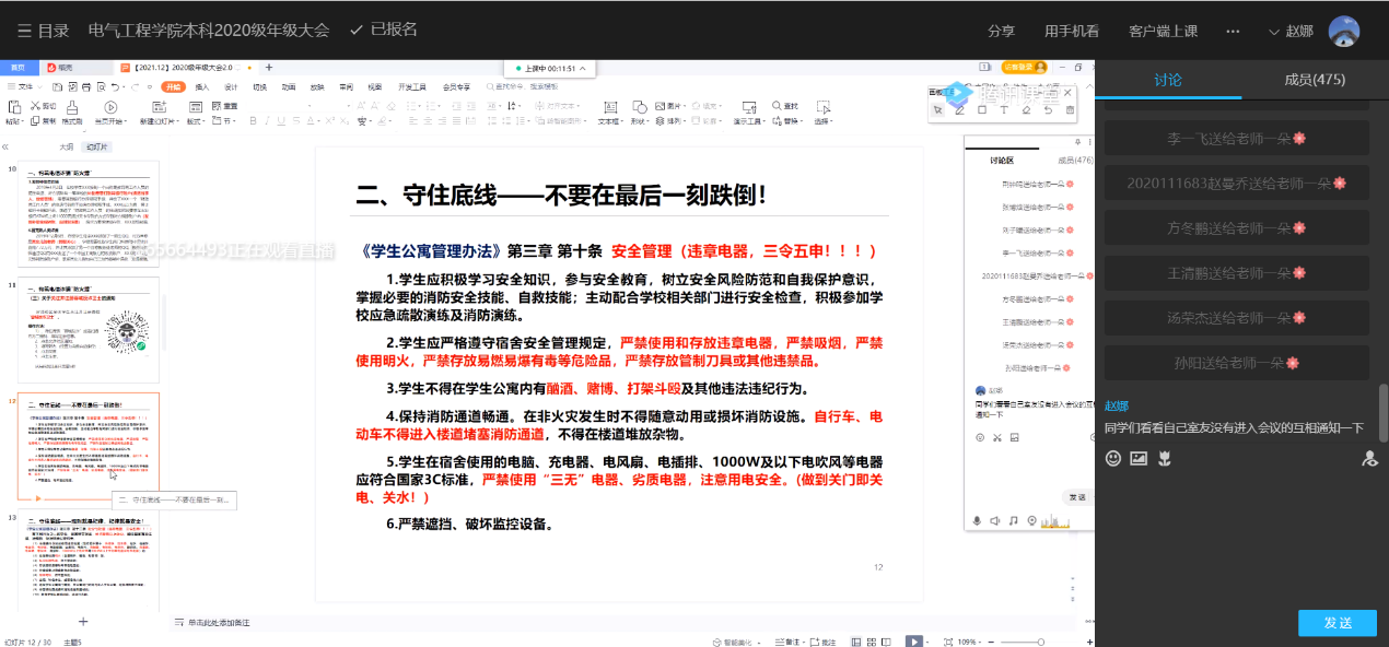 首先辅导员关怀指出疫情形式依然严峻,希望同学们提高防范意识,正确认识防疫事态,并提出做好个人防护、不点外卖、非必要不出川三点要求。其次嘱咐同学们要注意人身财产安全、防范电信诈骗、宿舍用电安全、遵守规章制度等。第三作英语四六级考试动员。指出四级为毕业条件,六级为加分项并敦促同学们每日打卡英语单词记忆。最后指出期末考试迫在眉睫,敦促同学们诚信考试,杜绝作弊。