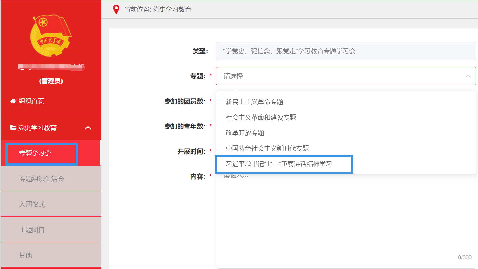 主题团课结束后,所有团支部都需将团课开展情况录入 “智慧团建”系统中“党史学习教育——专题学习会——习近平总书记‘七一’重要讲话精神专题学习会“中。