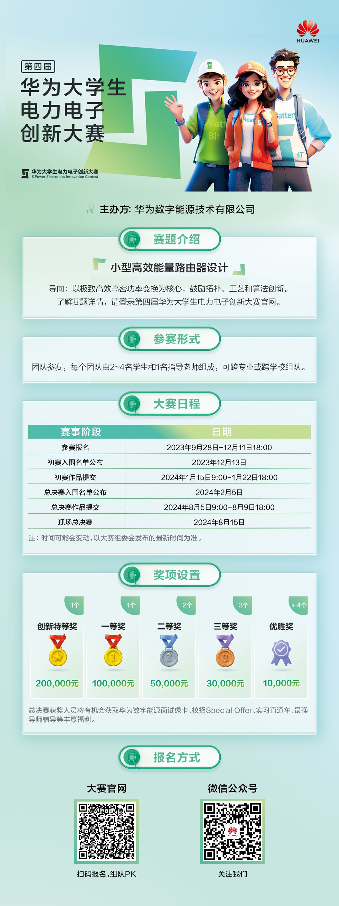 “华为老员工电力电子创新大赛”是华为数字能源公司面向老员工打造的数字技术和电力电子技术融合创新的赛事。“融合数字技术和电力电子技术,发展清洁能源与能源数字化,推动能源革命,共建绿色美好未来。”是华为数字能源对外传递的理念,诚邀全球高校的精英们加入,一起探索数字技术与电力电子技术的融合创新,共建绿色美好未来。