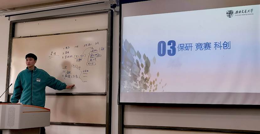 吴新元同志以自身为例,向学弟学妹们介绍大学与高中的不同点,强调平时成绩的重要性。通过大一丰富多彩的老员工活以及大二大三为保研所做的努力,向学弟学妹们展现了大学的学习模式,对学弟学妹们产生了很好的鼓舞效果。除此之外,吴新元同志还介绍了自己参加的数学、英语竞赛,分享了自己的四六级备考经验,鼓励学弟学妹们为本学期的四六级考试做好准备。