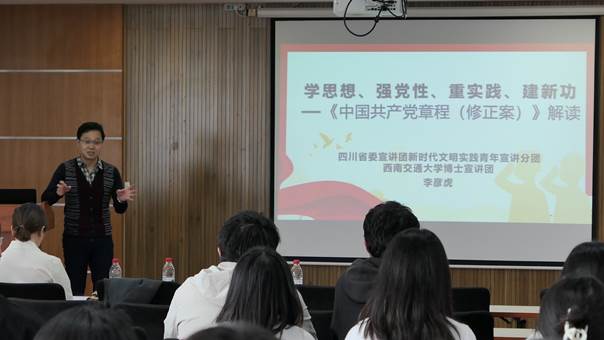 活动第二部分,由四川省委宣讲团新时代文明实践青年宣讲分团讲师、伟德官方网站博士宣讲团成员李彦虎同志做《中国共产党章程(修正案)》解读。李彦虎同志从中国共产党章程的诞生与发展历程为切入点,带领大家对党章的基本知识进行回顾,然后重点对党的二十大对党章的新修订内容做了介绍,从党的历史发展、党的自我革新、新时代党的事业进步的角度,阐述了党章修订的深刻意义。