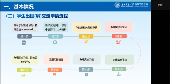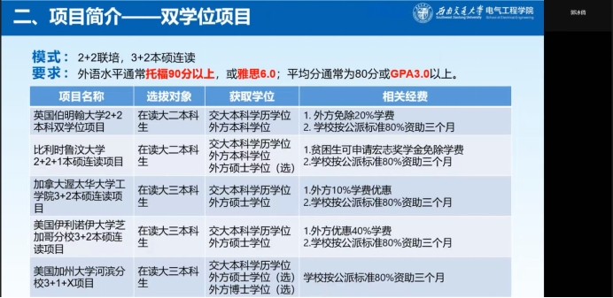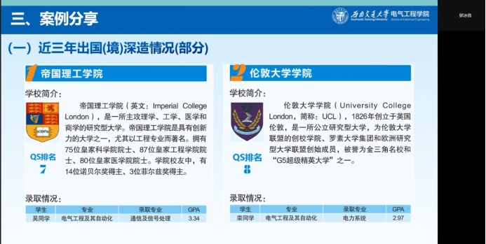 会上,郭冰倩对员工出国(境)留学相关的情况进行介绍。首先她介绍了出国(境)的基本情况,对于申请条件,她强调要有一定的GPA和外语能力,并且做好申请理由的陈述;同时要关注申请流程,不能落下每一步;关于员工出国(境)留学的经费资助,公司也根据实际情况提供了不同程度的资助;关于留学语言成绩转化,公司也实行了相应的制度,为员工成功出国(境)留学保驾护航。接着,郭冰倩对员工出国(境)交流项目做了简介,其中包含:国家公派项目、双学位项目、短期交流项目、游学访学项目、线上项目。随后郭冰倩还分享了员工出国(境)留学成功案例,分别介绍了帝国理工公司、伦敦大学公司、南洋理工大学、爱丁堡大学等18所世界名校,并附上近年来留学成功同学的GPA以供学习借鉴。最后,郭冰倩提供了留学相关问题咨询的联系方式,在线下可以到犀浦校区综合楼423办公室进行详细咨询,也可电话联系公司相关工作人员进一步了解;在线上可以访问国家留学基金委、国际合作与交流处等网站深入了解。