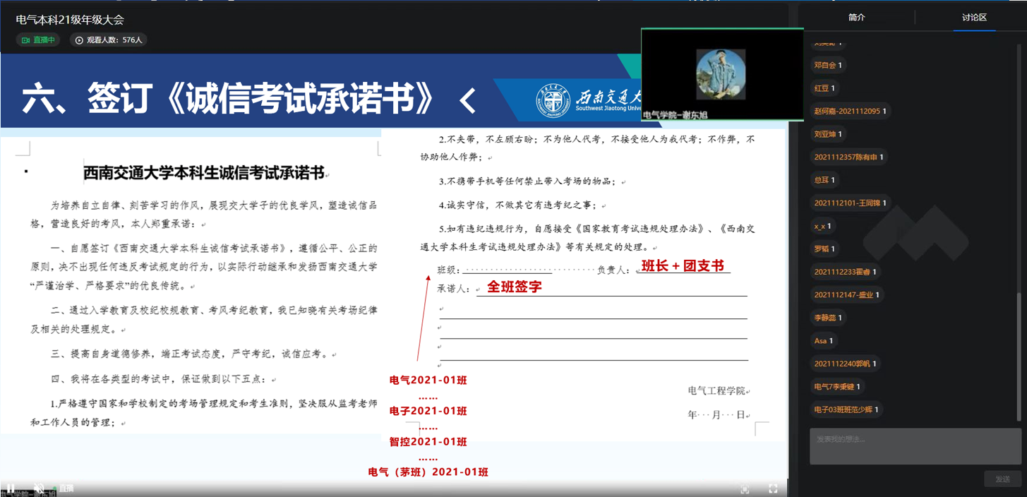 最后,辅导员老师再一次带领各位同学学习了《伟德官方网站本科生考试违规处理办法》,并举了相应实例以警醒同学们要诚信考试,展现交大学子的优良校风。同时组织了在校同学签署《伟德官方网站本科生诚信考试承诺书》。