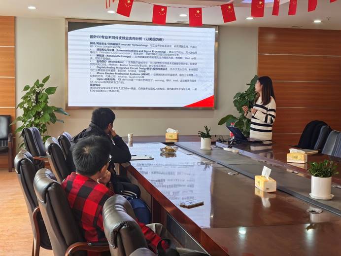 随后,张异老师分析了国内就业形势,以及国外EE专业不同分支的就业去向和薪资情况。紧接着,她从时间、费用、专业、未来发展等方面,对国内读研和出国(境)留学进行了对比,鼓励同学们寻找适合自己的毕业去向。