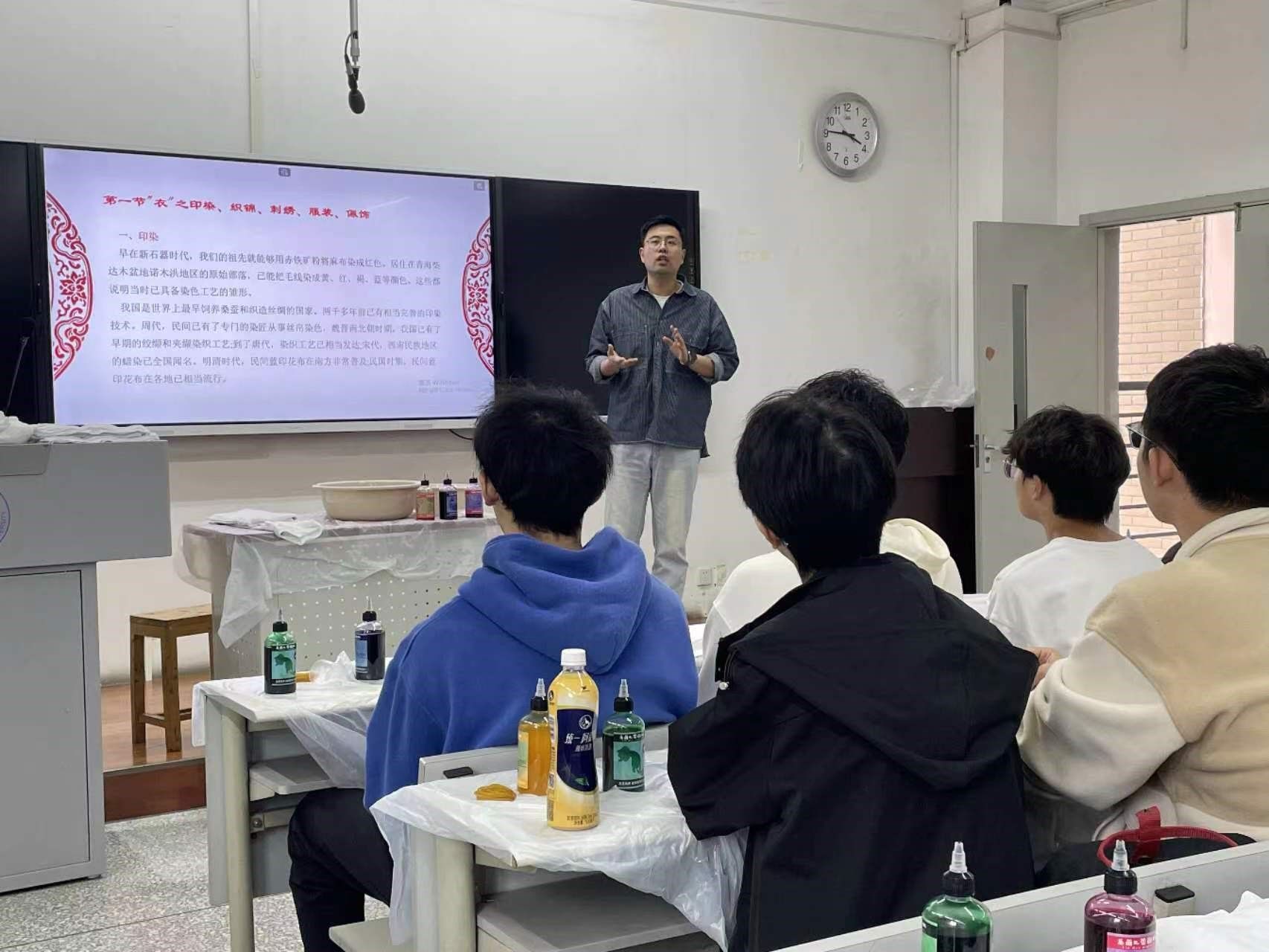 首先,刘老师通过PPT向同学们展示了非遗文化的相关历史文化知识,通过一张张生动的照片向大家展示与扎染相关技术的内容,同时也让大家看到了许多不同技艺的作品,让同学们对非遗作品有了新的认识和了解,也对非遗文化产生更浓厚的兴趣!在老师的引导下,同学们进行了激烈的讨论,对后续制作自己的作品进行构思!