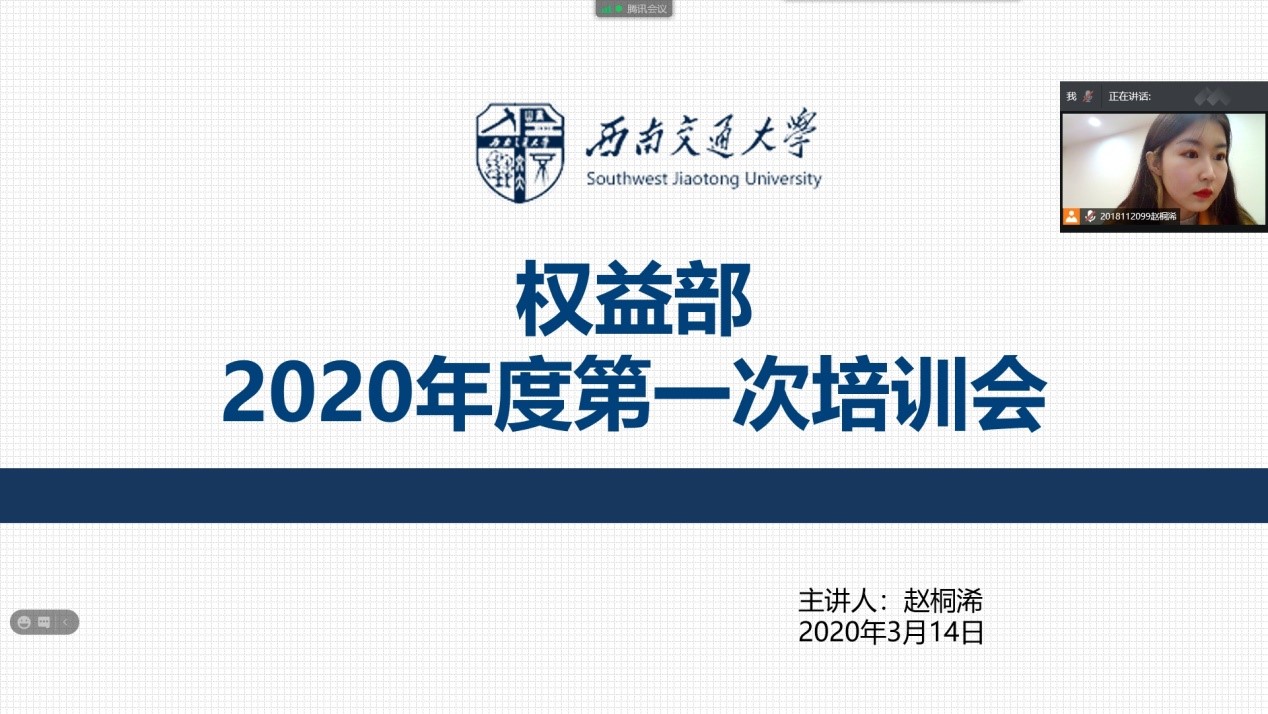 本次线上会议主要由三部分组成。首先由主持人赵桐浠简单介绍权益部工作,总结汇报权益部上半学期的工作成果。
