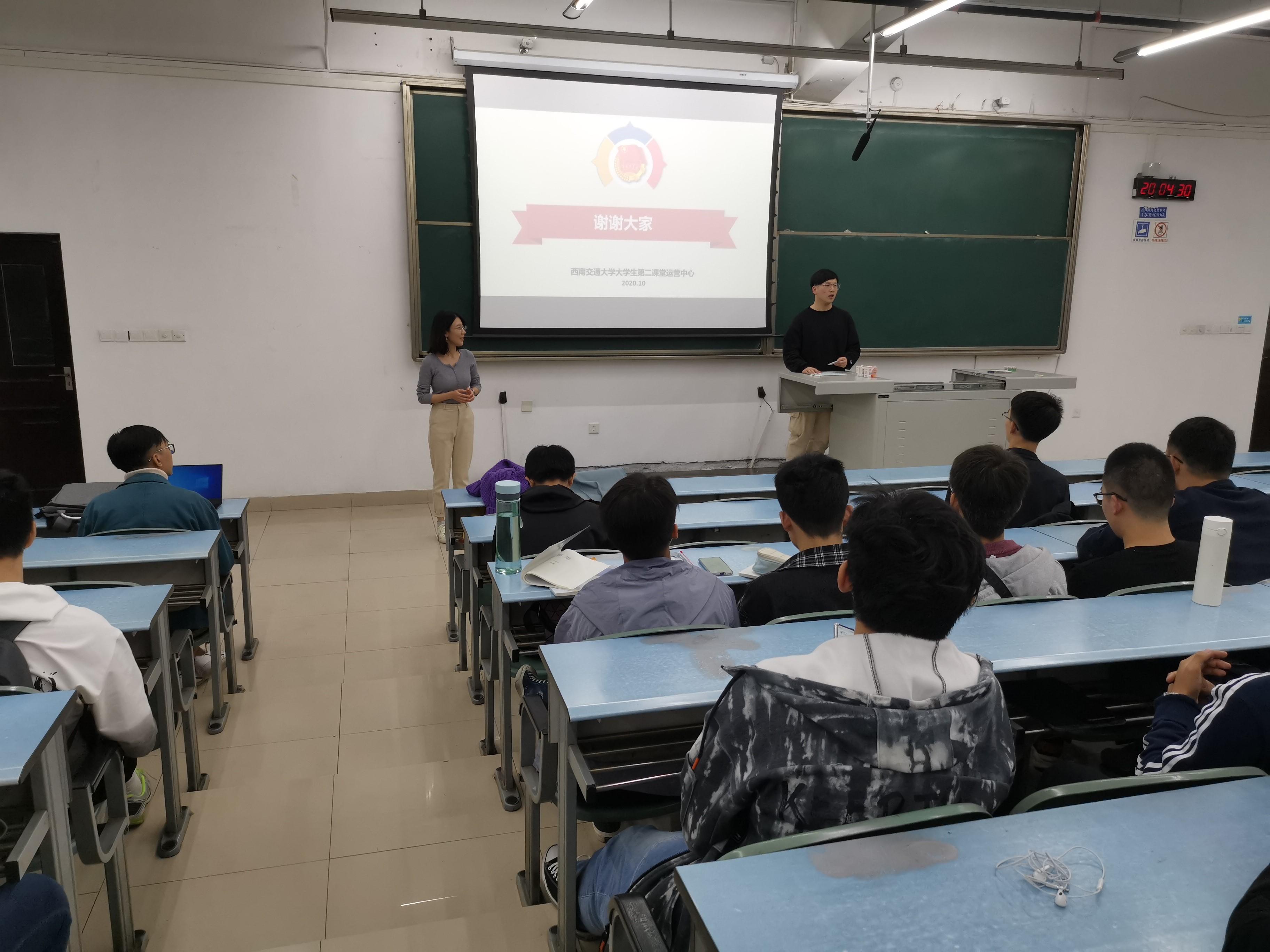 在讲座上汪宣霖老师向2020级新生们详细介绍了公司第二课堂的基本情况。向同学们介绍了西南交大“第二课堂成绩单” 信息管理系统,告诉同学们如何通过新青年素质网平台和交大有思微信公众号手机平台进行第二课堂的选课。并向大家详细说明了第二课堂的学时设置。