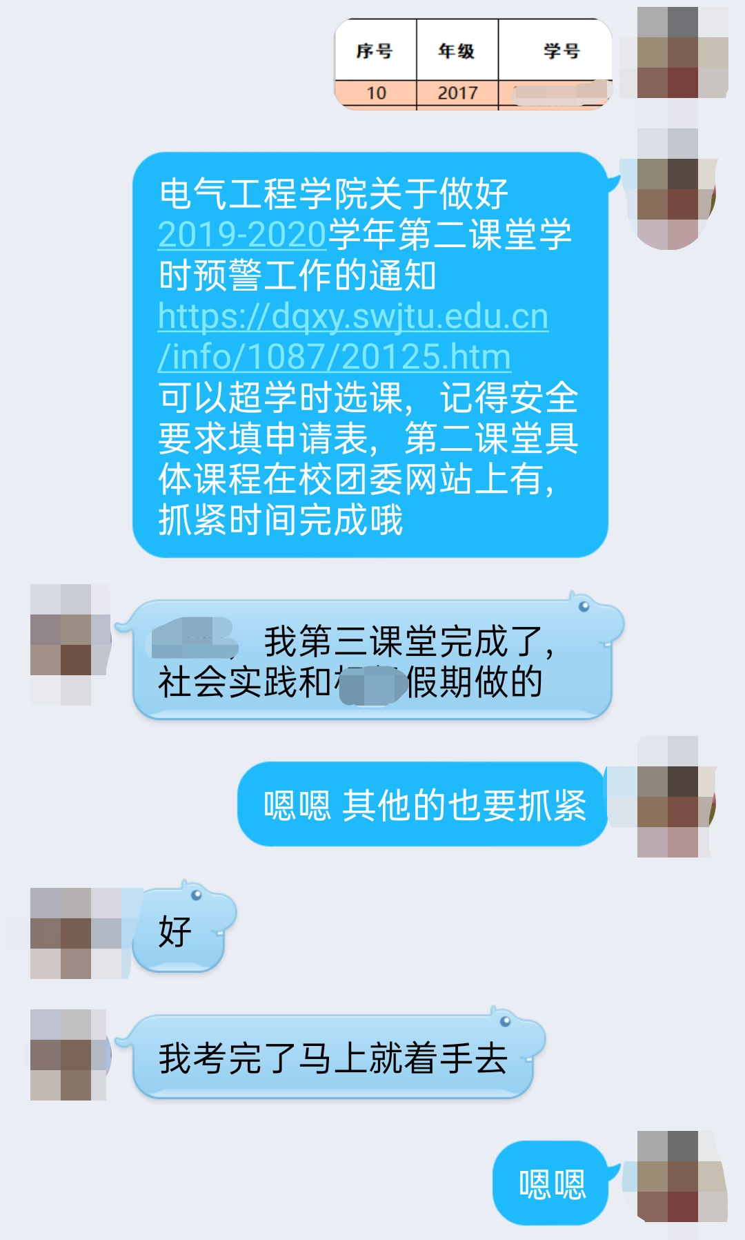 通过院网公告、QQ群公告、年级大会、员工骨干培训会等途径强调第二课堂学时重要性,并指定各班班长、团支书重点帮扶第二课堂学时预警员工,要求确保本科2017级员工在本学期内达到第二课堂学时的毕业要求,要求确保本科2018级、2019级在本学期内消除学时预警。