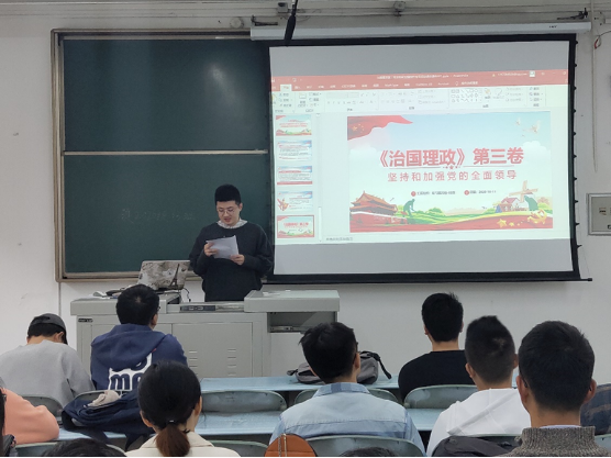 会议开始前,团支部书记杨锐同志在班级群中上传《习近平谈治国理政》(第三卷)的电子版文件,号召同学们认真阅读。会议开始,首先由党支部组织委员唐茂森同志进行PPT讲解,主要介绍了中国现代化和民族复兴的政治历程、中国共产党应运而生的深刻变革、中国共产党发展中国特色社会主义取得的成就等内容。会上,李亚鹏同学主动发言:“在第一专题7篇文章题目中,共有8个“新”字,因此,“新”字是第一专题的关键词”。他以“新”为关键字,围绕我国正处在实现“两个一百年”奋斗目标的历史交汇期,新时期就应有新气象、新作为,并号召同学们要激发学习工作的热情,并提出了四点倡议:研究生应具备良好的心理素质、诚信科研、热爱学术的强大内心、提升自我管理的能力、牢记使命与担当。