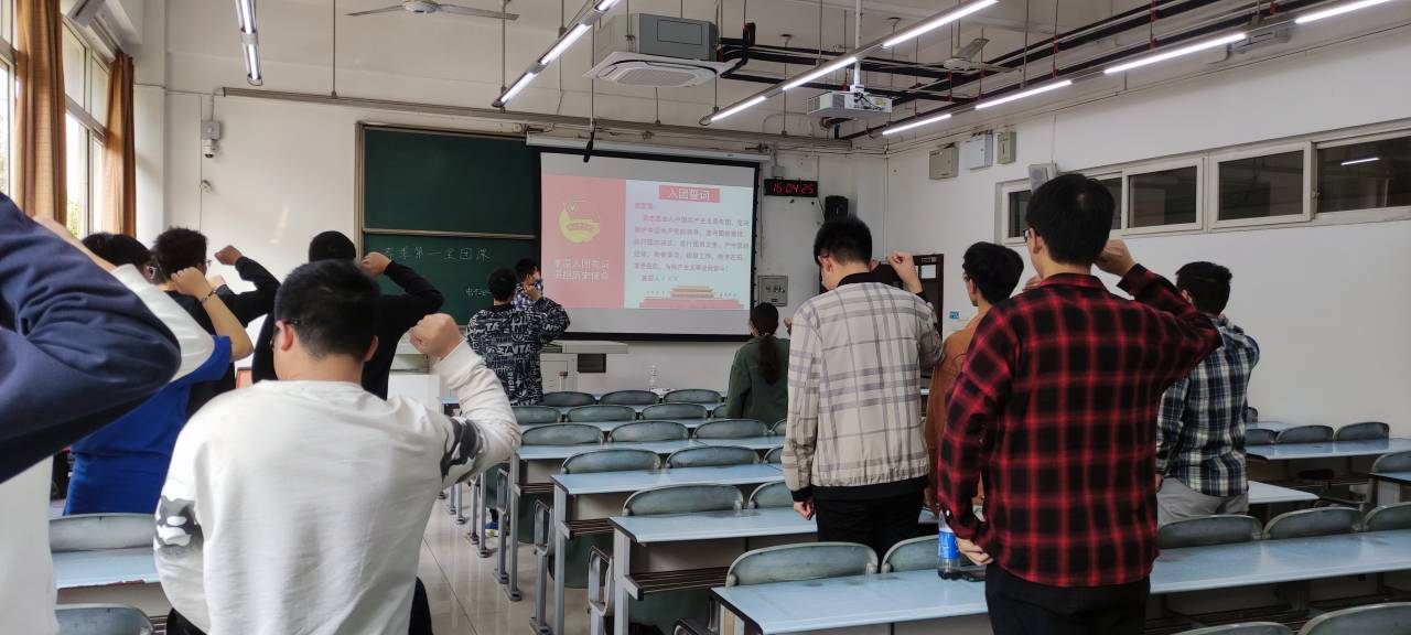 在响亮的团歌中,本次专题学习会正式开始。首先,由团支书为同学们讲述我们党从革命中走来、我们党从新中国建设中走来、我们党从改革开放中走来、我们党带领人民走进新时代四个部分内容,接着播放视频《习近平总书记讲述百年征程》《社会主义改造基本完成》《重温改革开放伟大壮举》《党的十八大以来的历史性成就和历史性变革》,最后全体团员重温了入团誓词