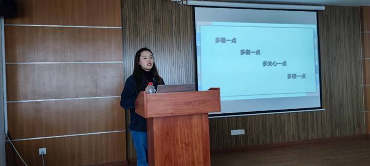 会议第二部分,由电气2019-11班班长杨语菲分享班级建设经验。杨语菲从“四个多一点”展开:一是多看一点,即应该观察比自身优秀的班级建设情况、管理方式,听取同学们的建议,并从中汲取营养;二是多做一点,如公司下达通知时,应先检索关键信息整合后再通知同学,不应只是机械地转发,要注重细节的处理和重点的突出;三是多关心一点,班委应充分了解班级同学的特点、关注同学心理情况,让同学们倍感温暖,主动融入班级建设中;四是多想一点,即在各种班级比赛中,思考从哪方面入手可以更好地展现出班级特色,在千篇一律的展示中让评委眼前一亮。最后杨语菲谈及学风建设和班团建设方面,提出了各班应定期进行团建,以合适的方式来增进同学间的感情;也应注重学风建设,设立一对一或者多对一帮扶机制,灵活开展集体早晚自习,形成浓厚的学习氛围。在证书考级方面,实行考级保险制度,鼓励同学进行四六级考试,形成持续性、长期性学习英语的态度。