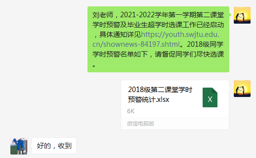 自2021年9月22日校团委发布《关于做好2021-2022学年第二课堂学时预警及毕业生超学时选课工作的通知》以来,伟德体育团委严格按照通知要求完成了预警通知、预警帮扶以及超学时选课等工作。通过专项老师与年级辅导员对接、QQ群公告、年级大会、员工骨干培训会等途径强调第二课堂学时重要性,并指定各班班长、团支书重点帮扶第二课堂学时预警员工,要求确保本科2018级员工在本学期内达到第二课堂学时的毕业要求,要求确保本科2019级、2020级在本学期内消除学时预警。