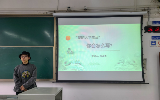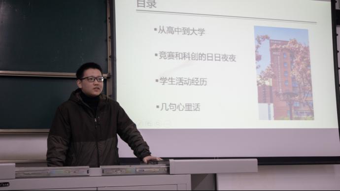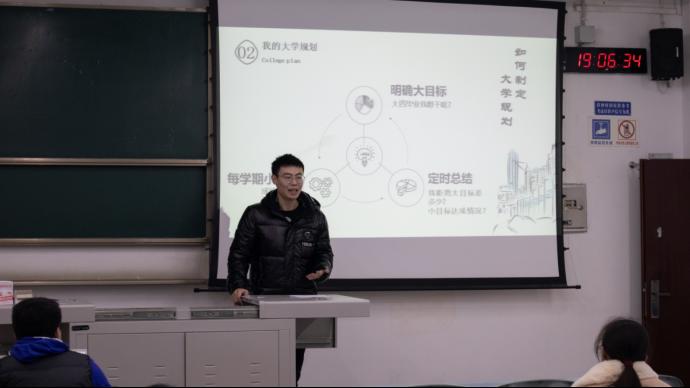 朱晨杰开篇便向同学们提出一个问题,“如果以‘我的老员工活’为题,写一篇作文,你会怎么写?”围绕着这个问题,他以自我介绍,学习之旅,干部经历,生活爱好,感悟总结五个模块来讲述自己会怎么写“我的老员工活”。在课程学习上,他主要强调了笔记、及时总结反思和自主学习的必要性,鼓励同学不要懈怠,抓紧时间提升自我。此外,他在课外竞赛和科研训练方面也结合自身经历给出了独到意见。丰富的干部经历不仅增强了他的责任心,也提高他的沟通交流能力和组织协调能力。他还鼓励同学们去培养更多元、更开放、更有益身心的兴趣,不要沉迷于游戏和追剧。最后,他总结到,有自己的定位,有时间的管理,有自学的能力才是当代青年人迈向成功的必由之路。