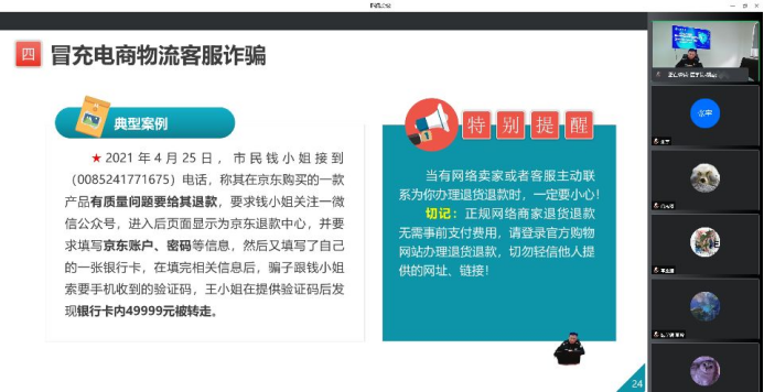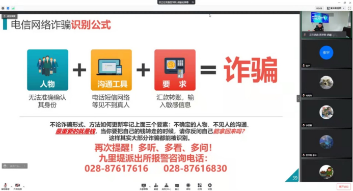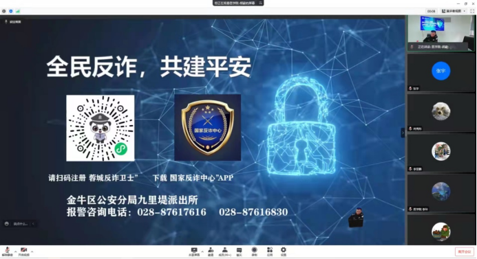 为进一步提升研究生防范网络诈骗的安全意识和防范能力,筑牢校园稳定安全防线,4月14日上午10:00,伟德体育联合医公司面向两院研究生共同举办了反诈防骗教育“专题讲座”,讲座邀请九里堤派出所赵磊警官担任主讲人,通过网络会议形式,结合高校员工群体电信诈骗案例,向同学们宣讲反诈防骗相关知识。