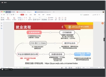 首先,沙静馨老师从常规的7步就业流程引入,直观地告诉同学们就业中需要经历的流程和关键性,并围绕这七个流程逐一展开讲解,详细分析了每一步的时间点、可能存在的问题和解决办法。沙静馨老师还详细讲解了公司的一些就业政策,包括《伟德官方网站毕业生就业推荐表和协议书管理办法》《伟德官方网站毕业生就业奖评选办法》《伟德官方网站就业帮扶经费管理办法》等。除此之外还分享了招聘信息的来源渠道,要求同学们从正规渠道进行应聘,谨防受骗。告诉同学们尽管现在面临疫情管控,但要保持积极的心态,关注线上招聘积极投递简历;同时找工作不要和同学之间横向比较,也不要和师兄师姐纵向比较,拒绝焦虑,适合自己的才是最好的。