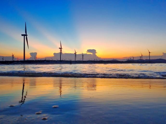 作品介绍:八月八日傍晚六点半左右,于福州市平潭县长江澳,用手机拍下了晚霞中风力田的绚烂景致。高耸的积雨云虽将晚霞部分遮挡,但其轮廓却如鎏金勾勒般灿烂夺目。大片的霞光慷慨倾洒,在天空中与其他颜色过渡得恰到好处,而大海将一切色彩忠实记录,每一朵浪花都如此明艳热切。