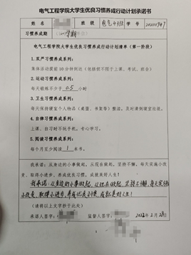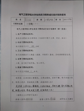 2022年2月,全体本科21级同学按照自己实际情况,填写《伟德体育老员工优良习惯养成行动计划承诺书》,并贴在自己宿舍位子上(墙、桌子、柜子门等显眼位置均可),将填写好的承诺书拍照上传班群及朋友圈。各位同学结合自己实际情况,自行设立承诺书上的双严习惯、运动习惯、卫生习惯、自律习惯和阅读习惯养成计划,并规定习惯养成期,自我监督或请他人监督。