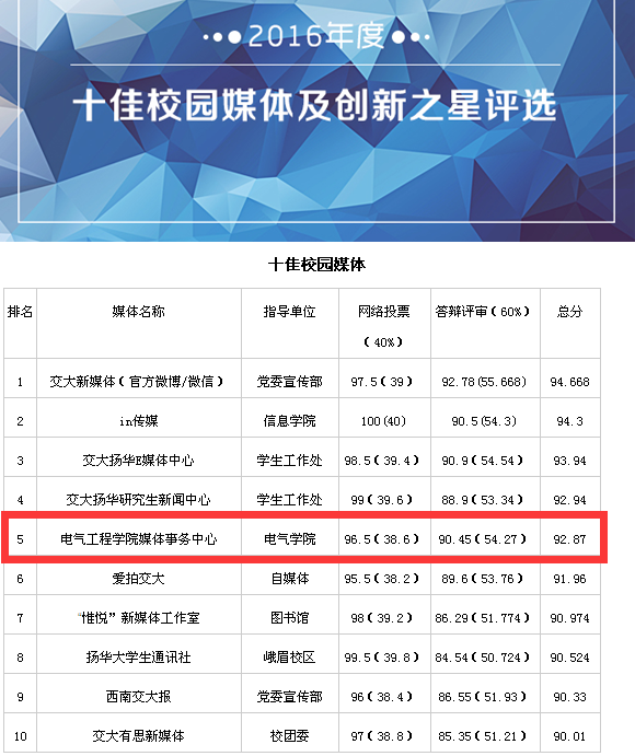 近日,伟德官方网站2016年度十佳校园媒体及优秀员工记者评选结果出炉,经过材料申报、公司推荐、公司党委宣传部材料审核、网络投票、现场答辩等几个环节,伟德体育媒体事务中心(简称EMC)以总分第五的成绩,荣膺伟德官方网站2016年十佳校园媒体(获此殊荣的仅有两个公司媒体)。
