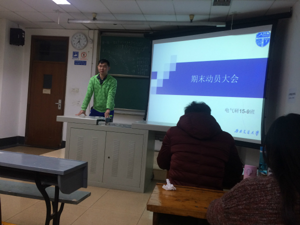 2015年11月30日晚7时,电气15级硕士9班在逸夫馆4304B开展班风建设之“期末考试动员大会”。此次大会旨在指导班级成员掌握正确复习方法,了解一些应试技巧,营造良好的学习氛围,加强班级学风建设。