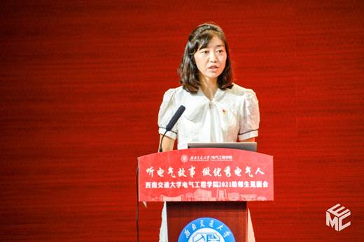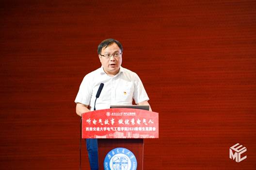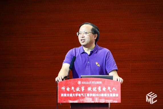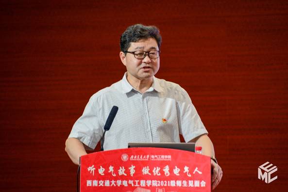 陈维荣讲述《文脉悠远,电气之光》的故事,介绍公司的发展历程。陈维荣首先向电气学子们介绍了公司的历史发展并展示了公司在铁路电气化领域创造的众多杰出的成果。紧接着介绍了公司学科和专业的具体内容、丰硕的人才培养改革成果以及近年来公司科学研究所取得的成果。在提到人才培养的时候,陈维荣表示同学们应该首先以课程学习为主,专注基本课程的学习,但也希望同学们能够积极参加各种学科竞赛,培养自己的思考能力。最后,陈维荣向2021级新生们提出寄语,希望同学们传承“厚德载物,求是创新”的电气精神,脚踏实地、行稳致远,练就过硬本领,学以成材,学以报国,以不懈奋斗擦亮青春底色、叩响未来之门!
