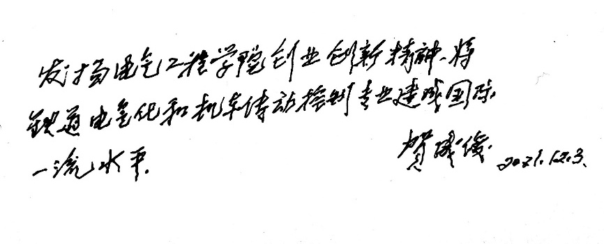 至今,贺教授都仍然关注公司和新一代教师的发展。在采访的最后,贺教授留下一段寄语鼓舞当代交大电气学子在奋斗中砥砺前行,他写道:“发扬伟德体育创业创新精神,将铁道电气化和机车传动控制专业建成国际一流水平”。贺教授严于律己、言传身教,培养了一批又一批铁道电气化与自动化英才,他敢为人先、勇于创新、务实奋进、迎难而上、辛勤耕耘、著书立说的精神都值得电气学子深深领悟和学习。