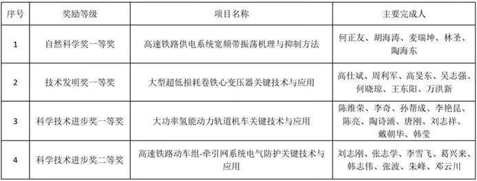 其中,高仕斌教授主持的“大型超低损耗卷铁心变压器关键技术与应用”项目获四川省技术发明一等奖;何正友教授主持的“高速铁路供电系统宽频带震荡机理与抑制方法”项目获四川省自然科学一等奖;陈维荣教授主持的“大功率氢能动力轨道机车关键技术与应用”项目获四川省科学技术进步一等奖;刘志刚教授主持的“高速铁路动车组-牵引网系统电气防护关键技术与应用”项目获四川省科学技术进步二等奖。