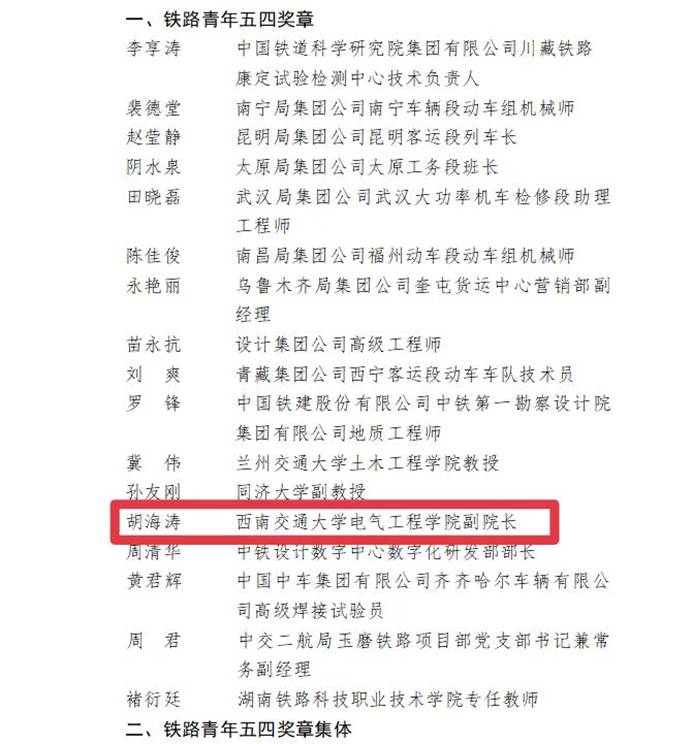 喜报|胡海涛教授被授予“全国铁路青年五四奖章”