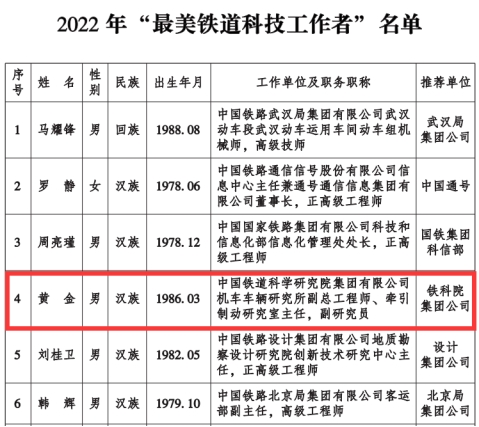 喜报|黄金院友获全国2022年“最美铁道科技工作者”称号