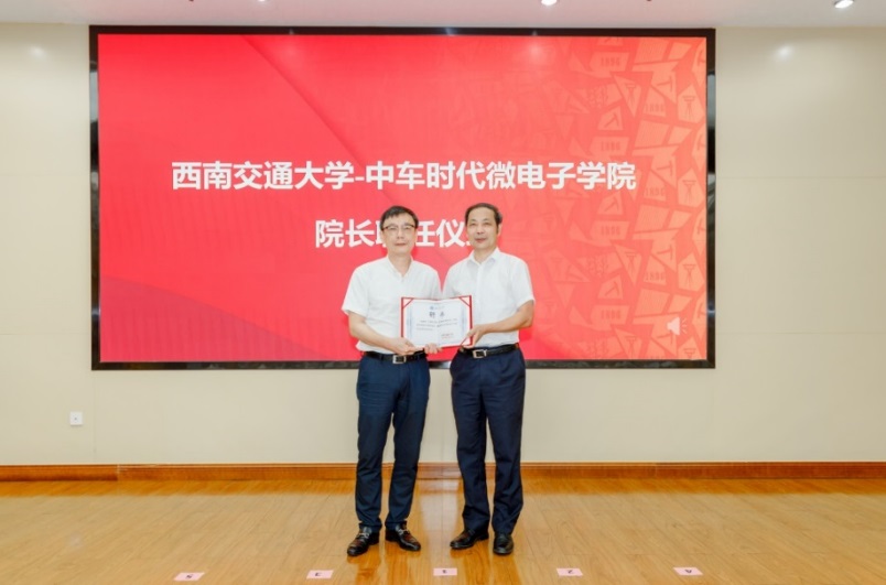 中国工程院院士,电力电子及控制技术专家,教授级高级工程师,中国中车首席科学家丁荣军出任西南交大-中车时代微电子公司首任经理,杨丹为其颁发聘书。