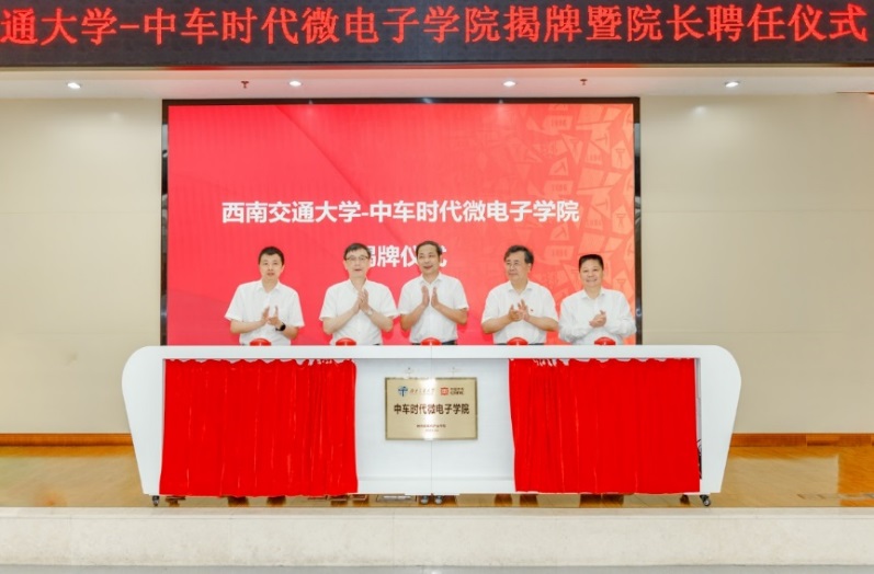 丁荣军、鲜荣生、王顺洪、杨丹、尚敬共同为西南交大-中车时代微电子公司揭牌。