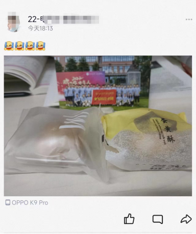 本科2022级邹玉菲:第一次离家千里过中秋,拿到的第一个月饼就是咱们伟德体育为同学们准备的。第一件事就是拍照发朋友圈炫耀哈哈哈哈哈。封校以来,虽然和老师同学们的见面少了,但线上的联络关心却一直没断过。从开学发的电子闹钟,到封校发的饭盒,再到中秋发的月饼,真的让我感受到了温暖与感动。疫情只能关上校门,却关不上咱电气人的心门!