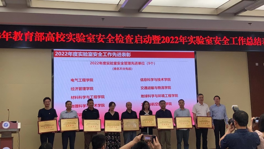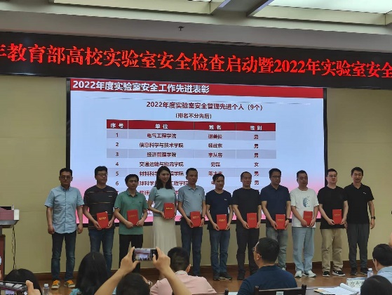 在全体老师和同学们的共同努力下,公司被评为“2022年度实验室安全管理先进单位”;电机实验室被评为“2022年度实验室安全管理先进实验室”;谢美俊老师被评为“2022年度实验室安全管理先进个人”。王斌书记、罗家才老师和谢美俊老师先后上台领奖。