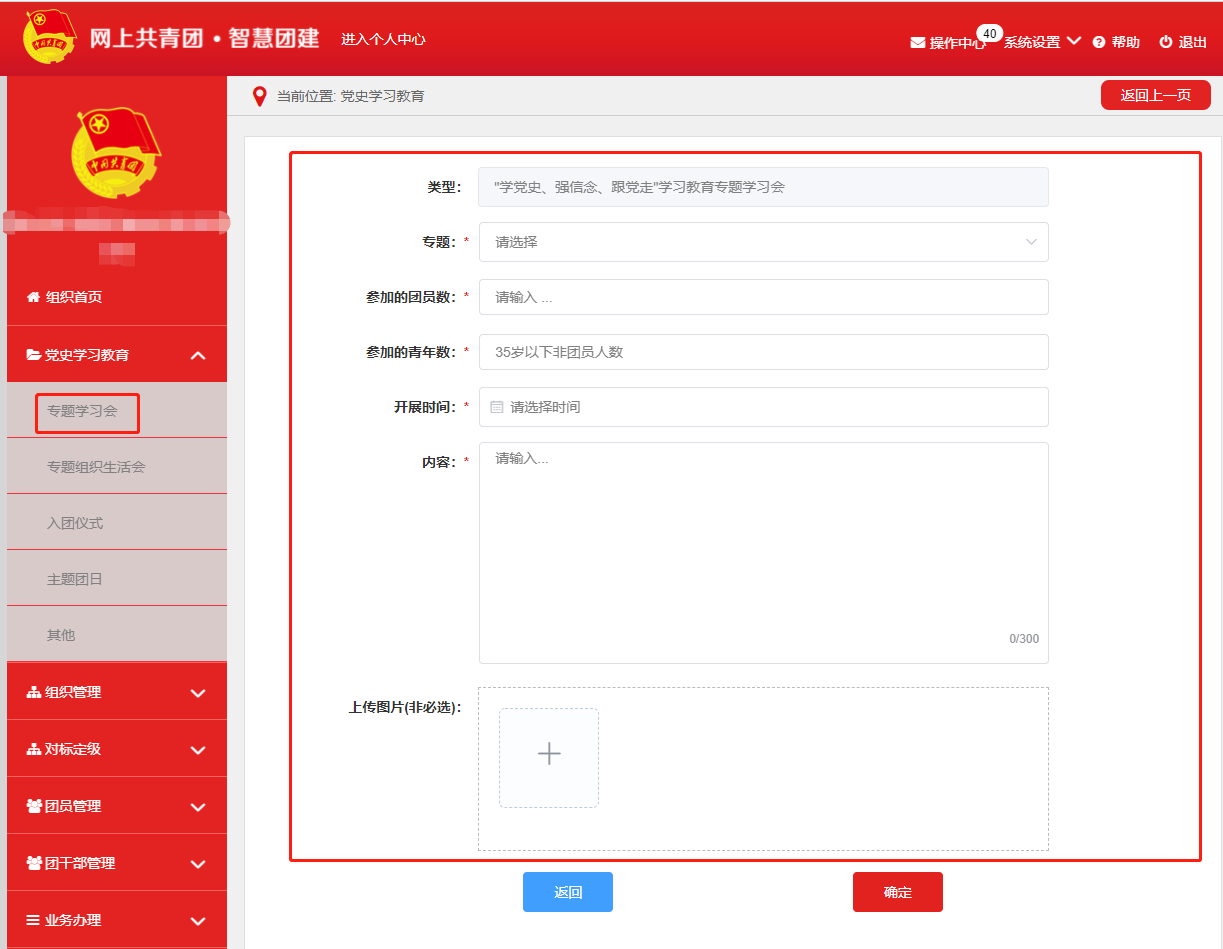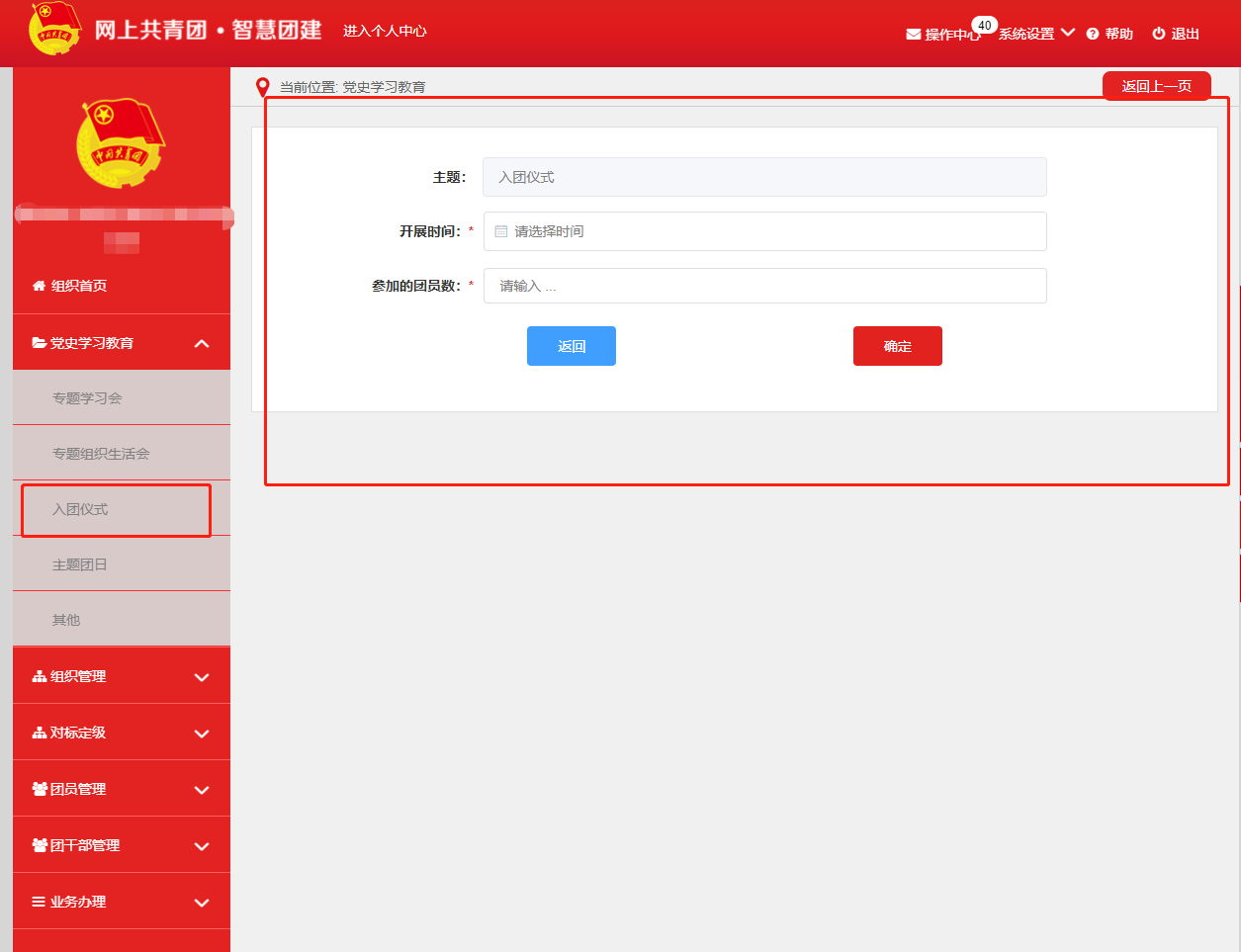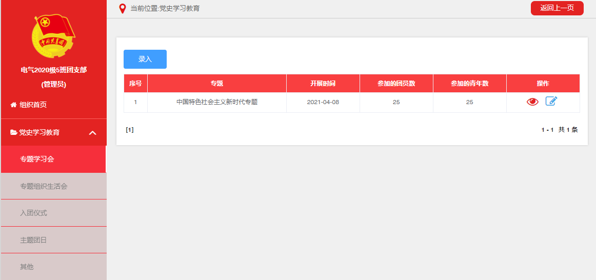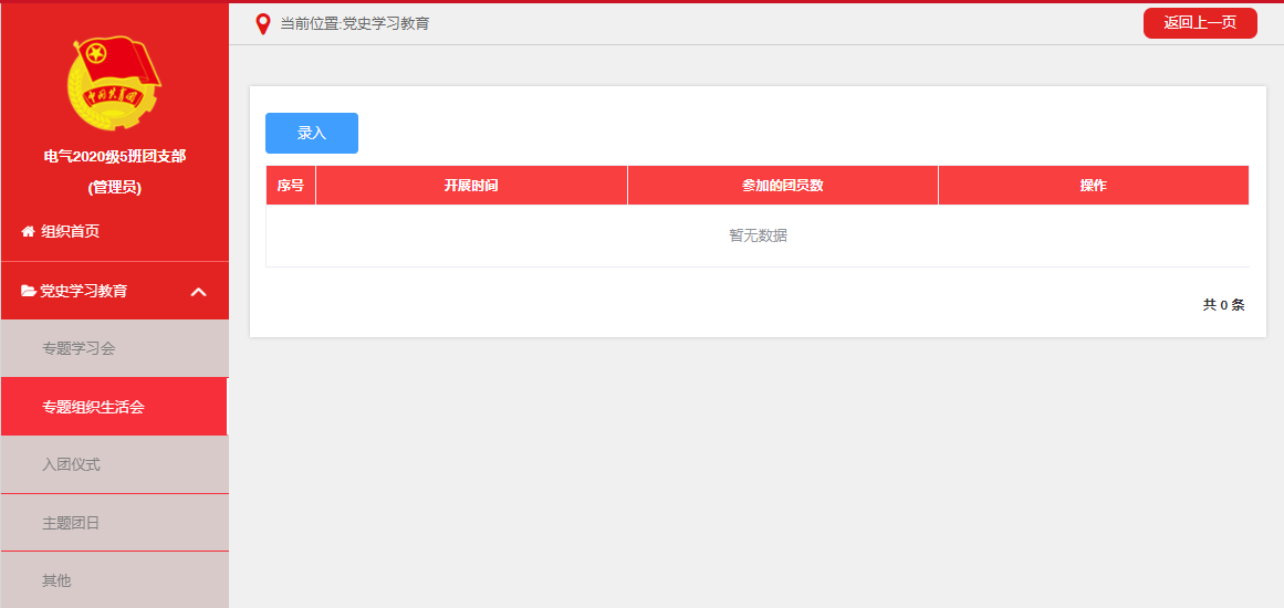 根据校团委及公司团委《2021年“学党史、强信念、跟党走”团员主题学习教育实践活动的实施方案》,各团支部需在“智慧团建”系统中“党史学习教育”模块记载学习教育情况,主要包括专题学习会、专题组织生活会、主题团日、入团仪式和其他实践教育活动开展情况及团干部开展专题宣讲等。“智慧团建”系统中“党史学习教育”模块具体录入要求如下。