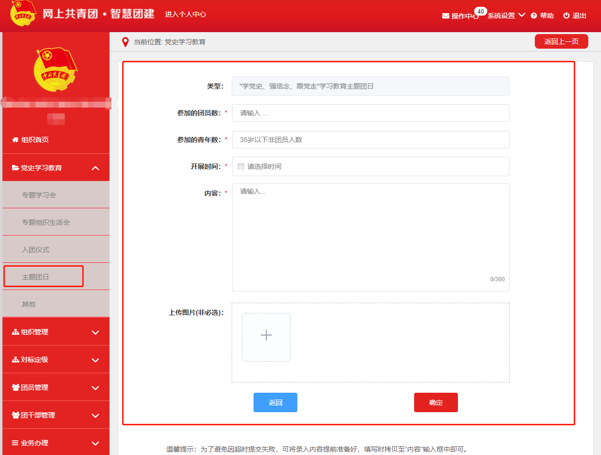 2.团日活动结束后,需及时将活动开展情况录入到“智慧团建——党史学习教育——主题团日”板块。智慧团建录入情况将直接纳入2021年团支部考核中。具体操作指南可参考附件:《全团“学党史、强信念、跟党走”学习教育线上记载功能操作指引》。