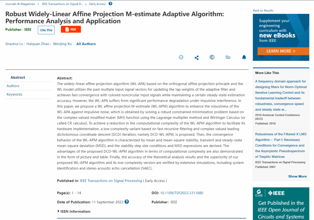 The paper of "Robust Widely-Linear Affine Projection M-estimate Adaptive Algorithm: Performance Analysis and Application" was accepted by IEEE Transactions on Signal Processing, with PhD student Shaohui Lv as the first author and Prof. Haiquan Zhao as the corresponding author.