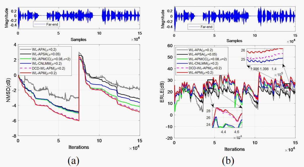 (a) NMSD performance curves for different algorithms (b) ERLE performance for different algorithms