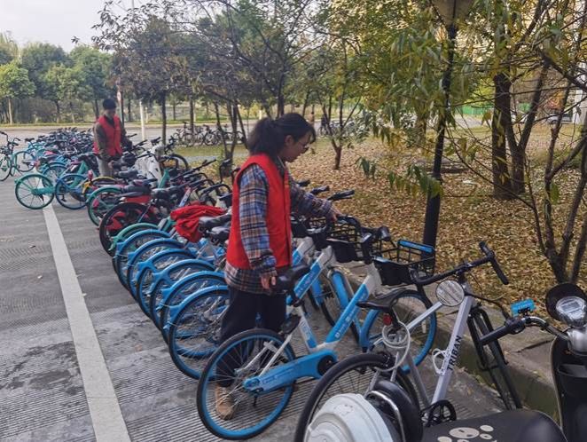经过第一党支部和第五党支部党员和预备党员的努力,电气馆周围停车区域的自行车被摆放的整整齐齐,显得干净美观。