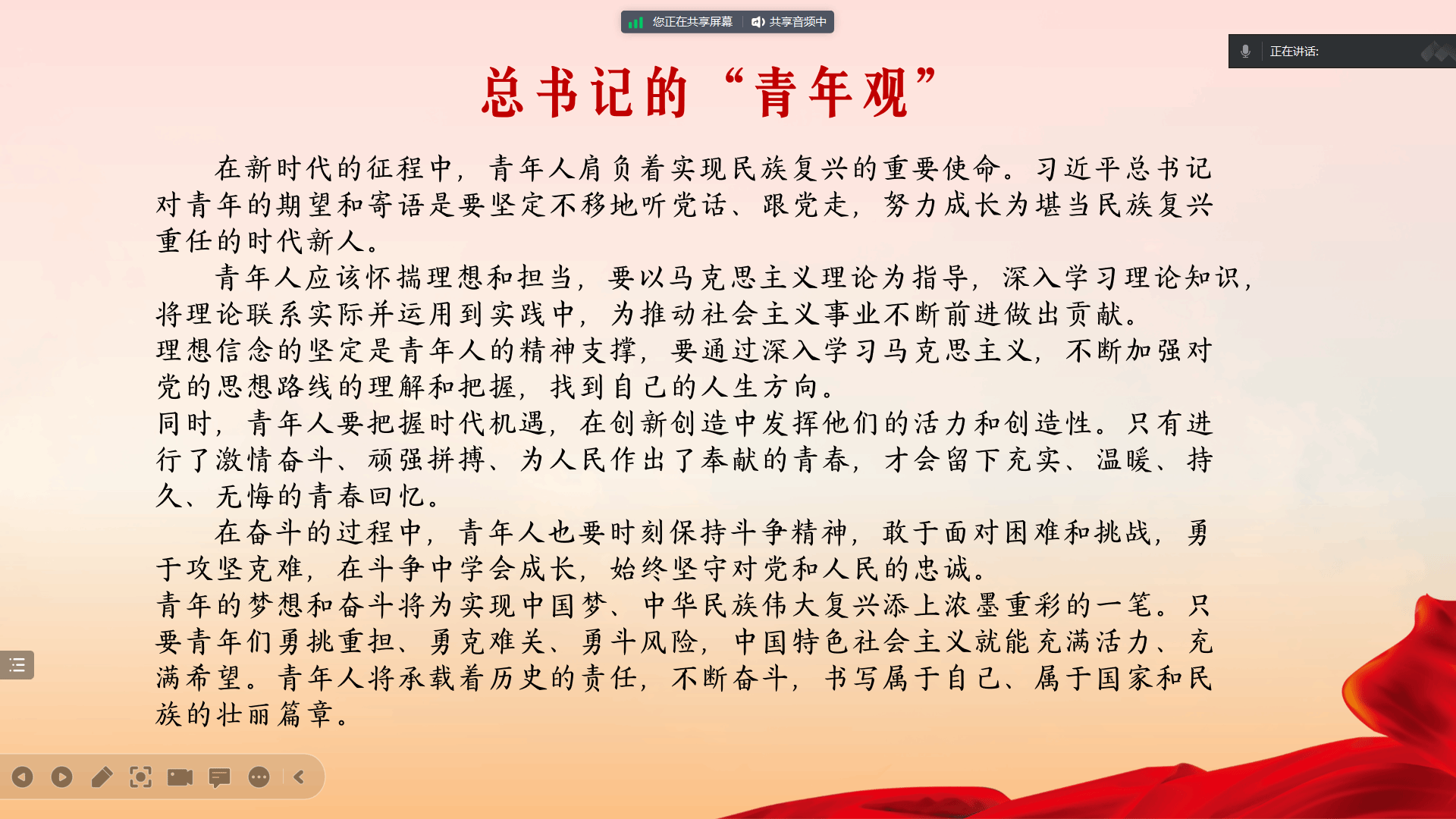 李博涵:青少年是社会运动的先锋。他们主动参与社会倡议,为党的执政目标贡献着新颖的观点和创意。在如今的数字时代,青少年也扮演着特殊的角色,他们是科技与创新的引领者。在日常中,更要重视培养青少年,为他们提供更广阔的平台,激发他们的创造力和责任感,相信在党的引领下,青少年将会成为中国特色社会主义的坚定建设者和接班人,为我国未来的繁荣与发展贡献着青春力量!