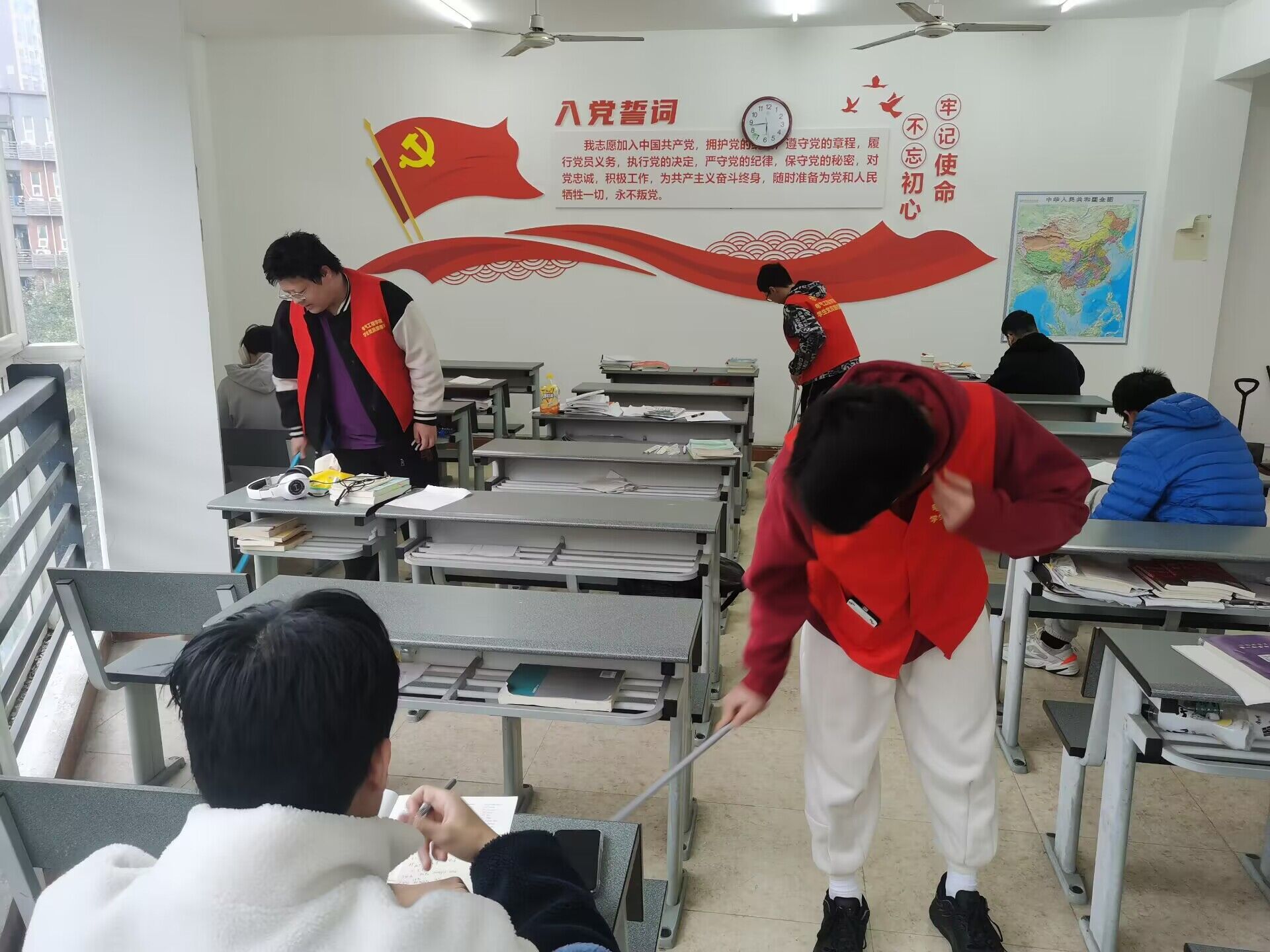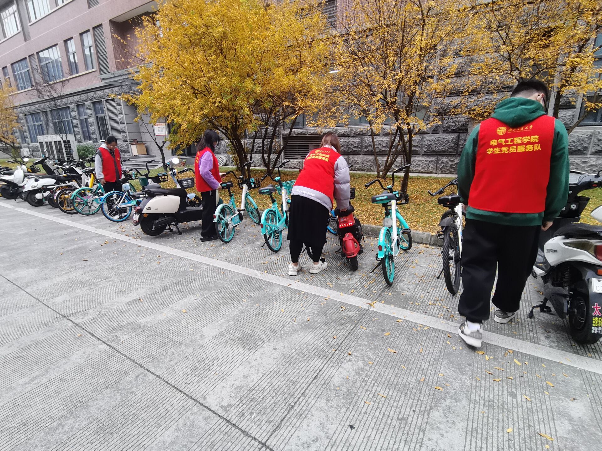 志愿服务是践行党员义务的一种具体表现,能够进一步巩固党员对党的认同和归属感,提高党员的凝聚力和向心力。党支部成员积极参与电气馆单车摆放及文明劝导和宿舍楼自习室清扫工作。这些具体行动不仅巩固了党员对党的认同和归属感,提高了党员的凝聚力和向心力,同时也为营造文明、有序的校园环境做出了贡献。通过维持整洁的学习环境和传递正确的价值观和行为规范,党员同志展示了自身的文明素质,并发挥了示范引领作用。
