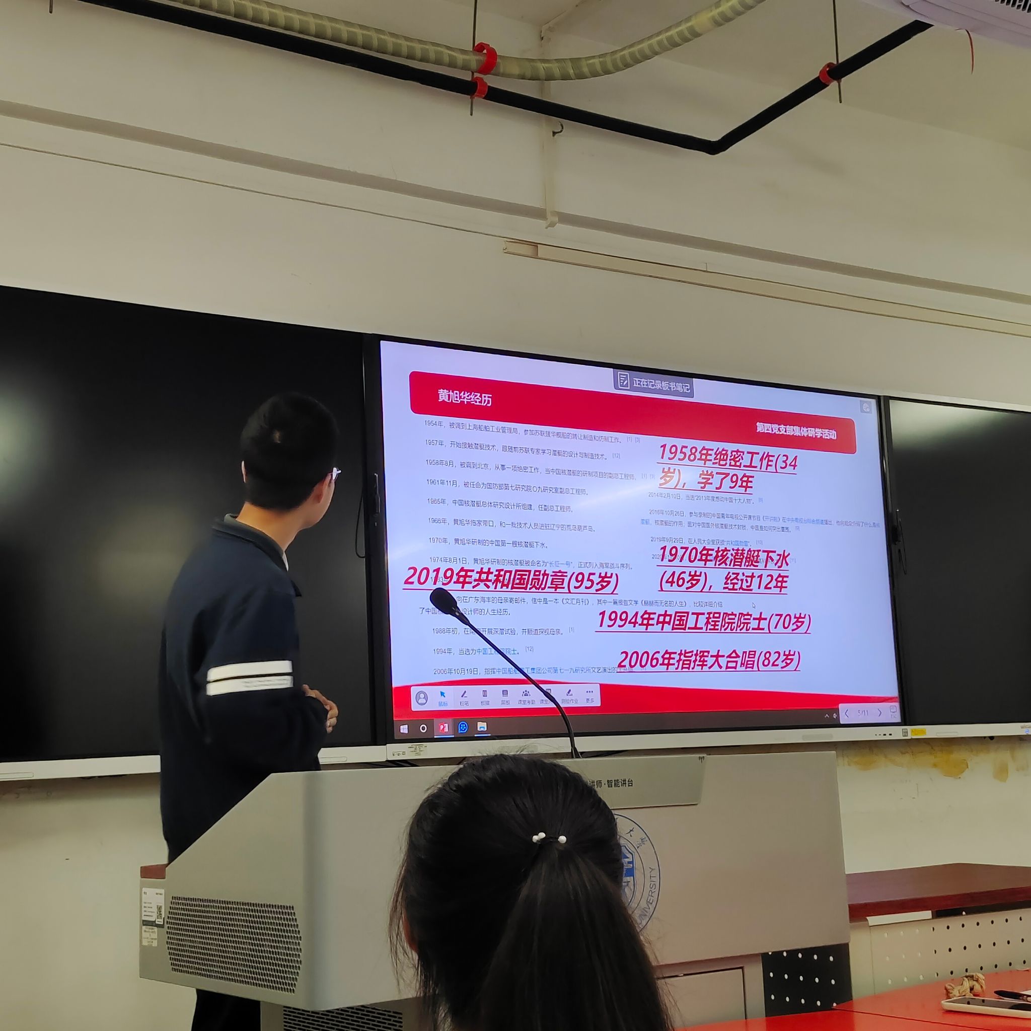 伫立于鲜红的党旗前,电气本科2020级第四党支部书记李连安琪身为领誓人,率领着新老党员们一起握紧右拳,庄严肃穆地回顾了入党誓词。宣誓后,由组织委员许成林带领支部全体成员围绕“共和国勋章”获得者——黄旭华进行研学讨论,结合当前时事等发表自身看法及作为年轻党员可以吸收学习的地方,引导大家共同思考,并在生活中起到党员同志的先锋带头作用。
