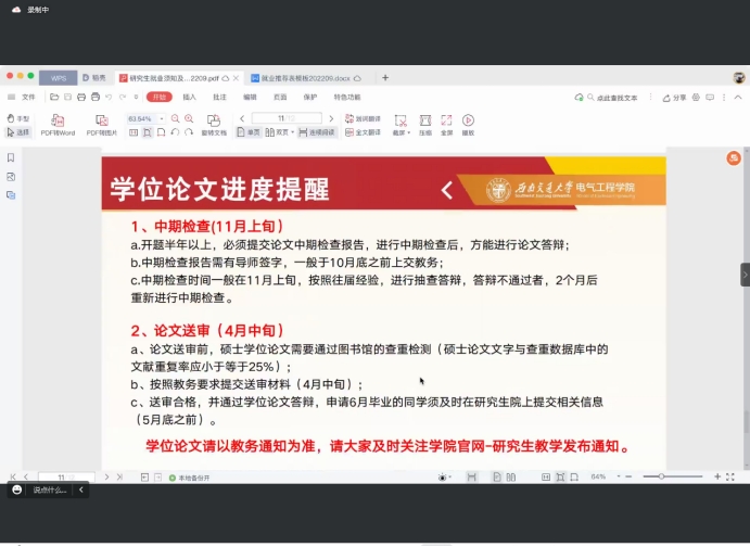 其次,沙静馨老师从中期检查和论文送审的大致时间,提醒全年级员工合理安排,找工作和写论文要两条腿走路,毕业作为前提更为重要,如果不能按时毕业,其他都为0。