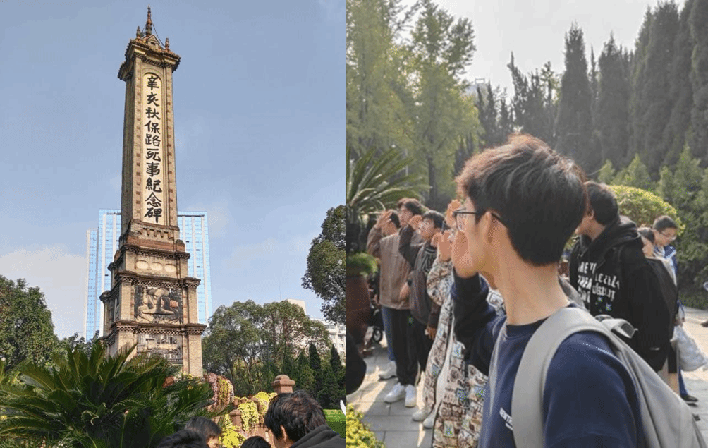 二、集体鲜花,致敬先烈。国旗下宣誓后,全体同学搭乘地铁来到了成都市人民公园。同学们与团支书一同参观了矗立在公园内的辛亥革命保路运动纪念碑,川军雕塑,同时深入学习了相关历史背景知识,深刻感受到先烈们的英勇与伟大,深切明白当今的幸福生活来之不易,并牢牢铭记历史,不忘初心使命。之后,每位同学都庄重地向纪念碑献花,将自己的爱国热忱寄托与花中,让先辈们看看当今中国正如这鲜花,正在绽放,正在富强。