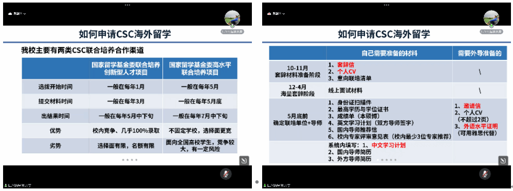 接着,雷杰宇博士基于自身申请经验向大家介绍了如何申请CSC海外留学。主要内容包括公司主要联合培养合作渠道的类别、个人需要准备的材料以及时间节点,同时建议同学们如果计划出国深造一定要早做准备,提高语言应用能力等。