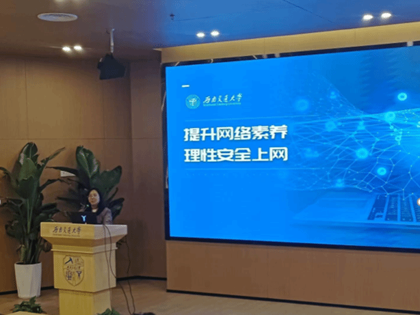 紧接着,两位老师开展“提升网络素养,理性安全上网”专题讲解。两位老师根据网络的特征,分析老员工网络失范行为与案例,让同学们意识到依法文明理性上网的重要性,并呼吁同学们要具备网络安全基本常识、网络信息甄别能力、借助网络学习的能力以及文明上网的自觉性。