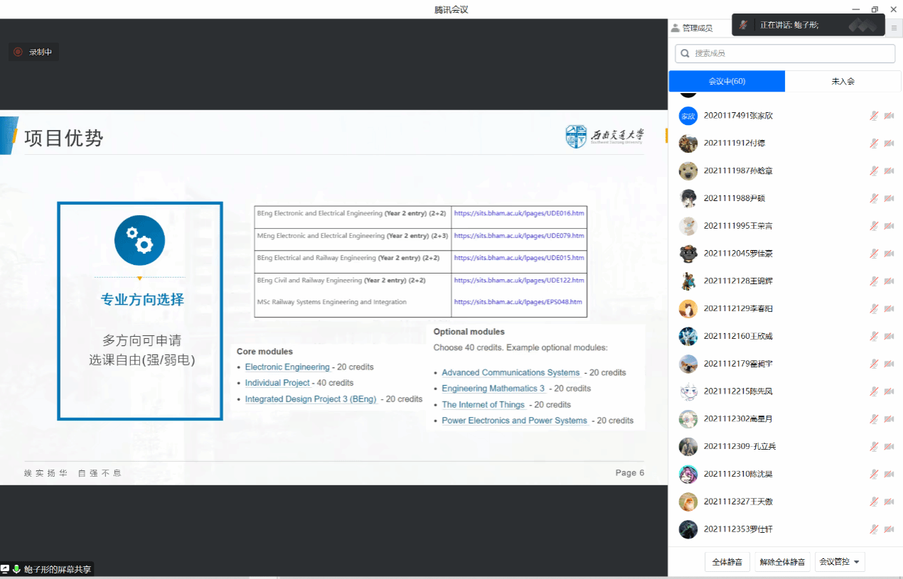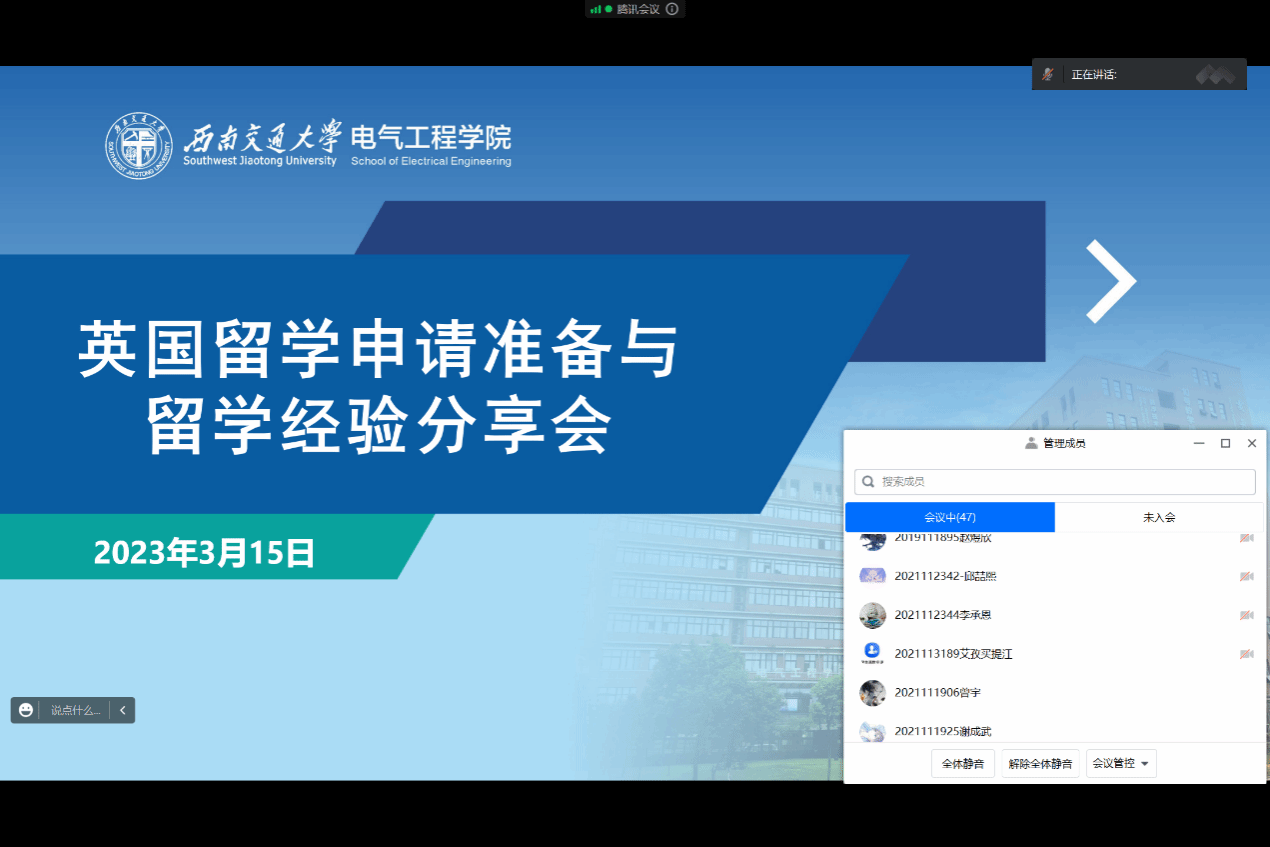 为促进国际化人才培养,加强员工对出国留学的认识和了解,3月15日,伟德体育在线上举办了英国留学申请准备与经验分享会。本次活动邀请了目前在英国留学的2020级电子信息工程专业的鲍子形同学和电气工程与智能控制专业的赵博儒同学,通过线上方式向同学们分享他们的留学申请经验和留学感受。