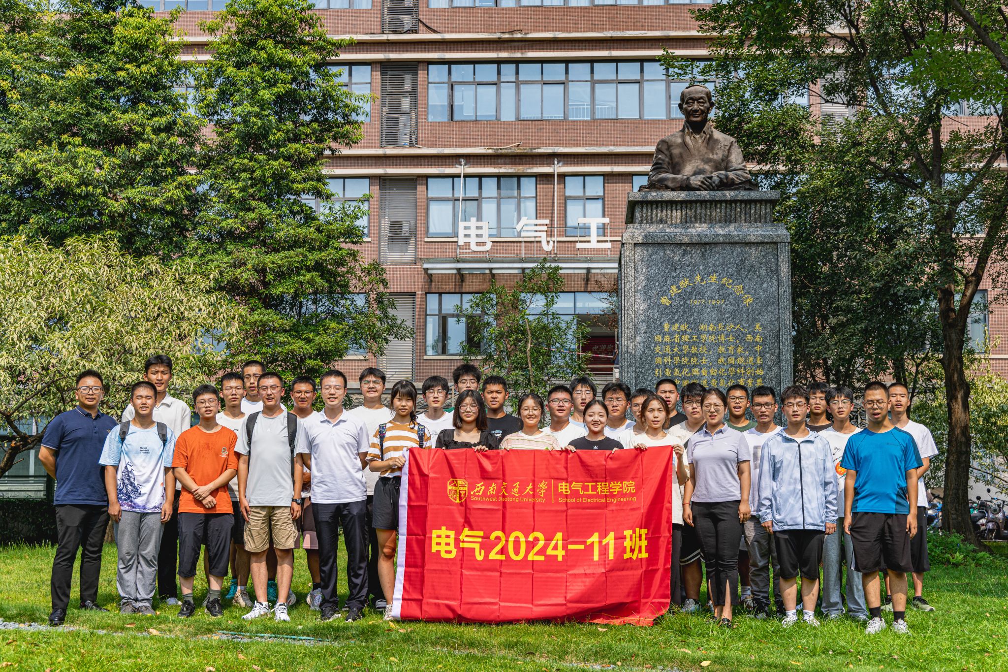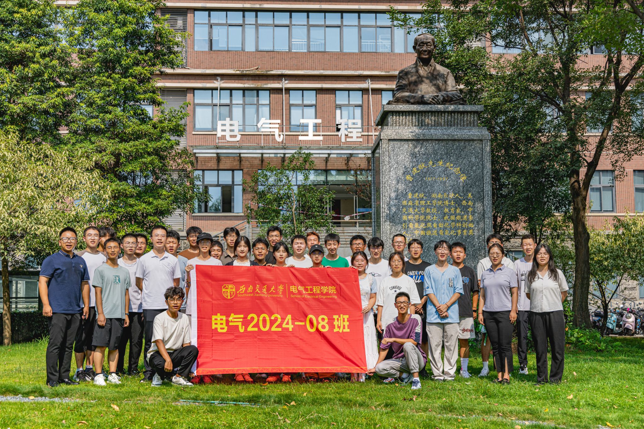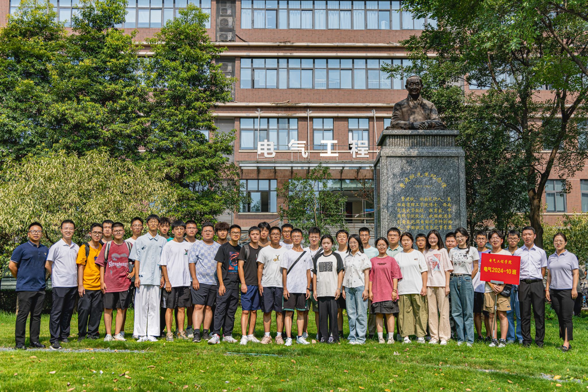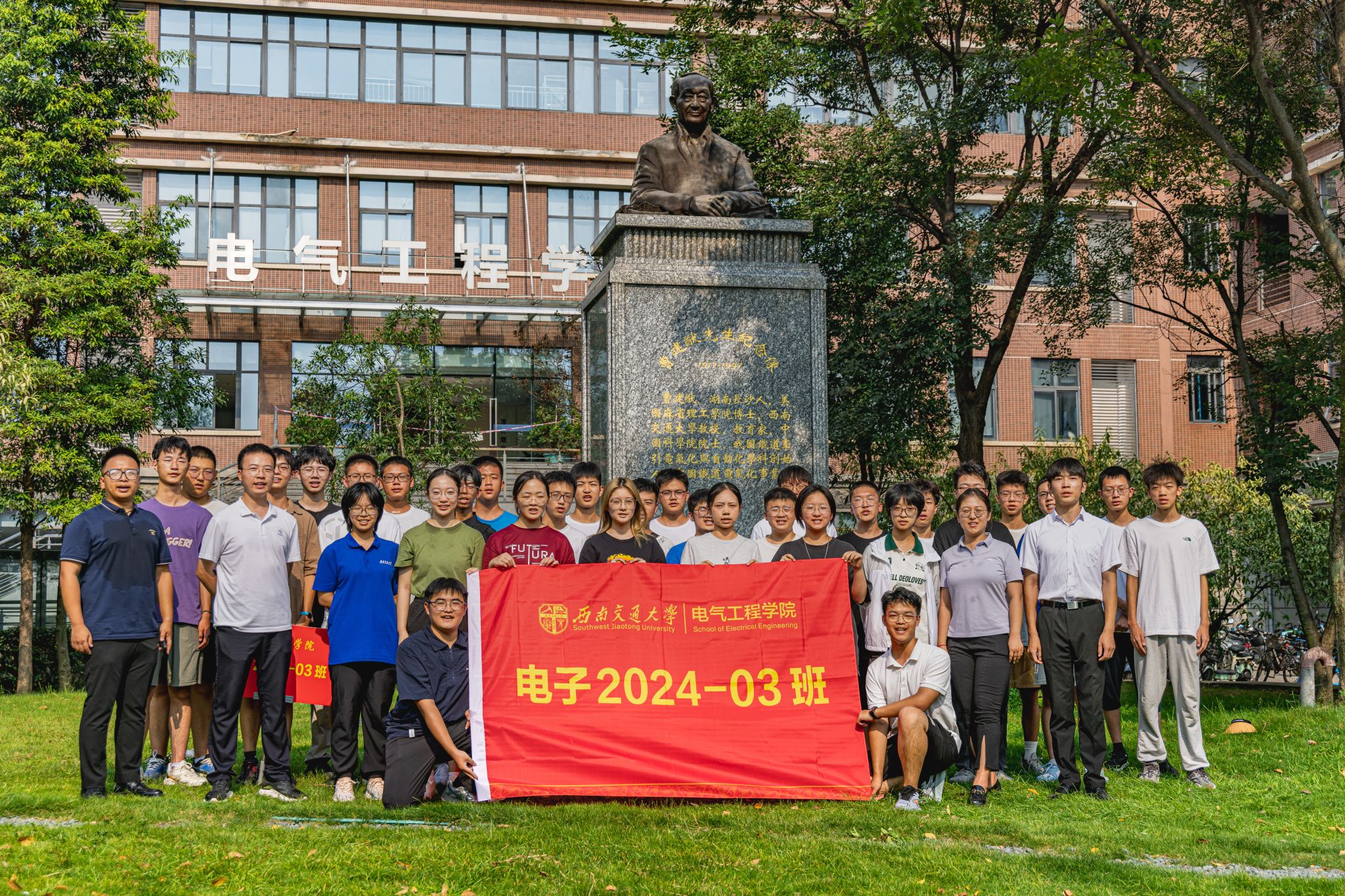 9月3日下午15时,公司2024级本科新生在辅导员老师以及辅导员助理的带领下来到电气馆,并在曹建猷院士铜像前进行班级合影。
