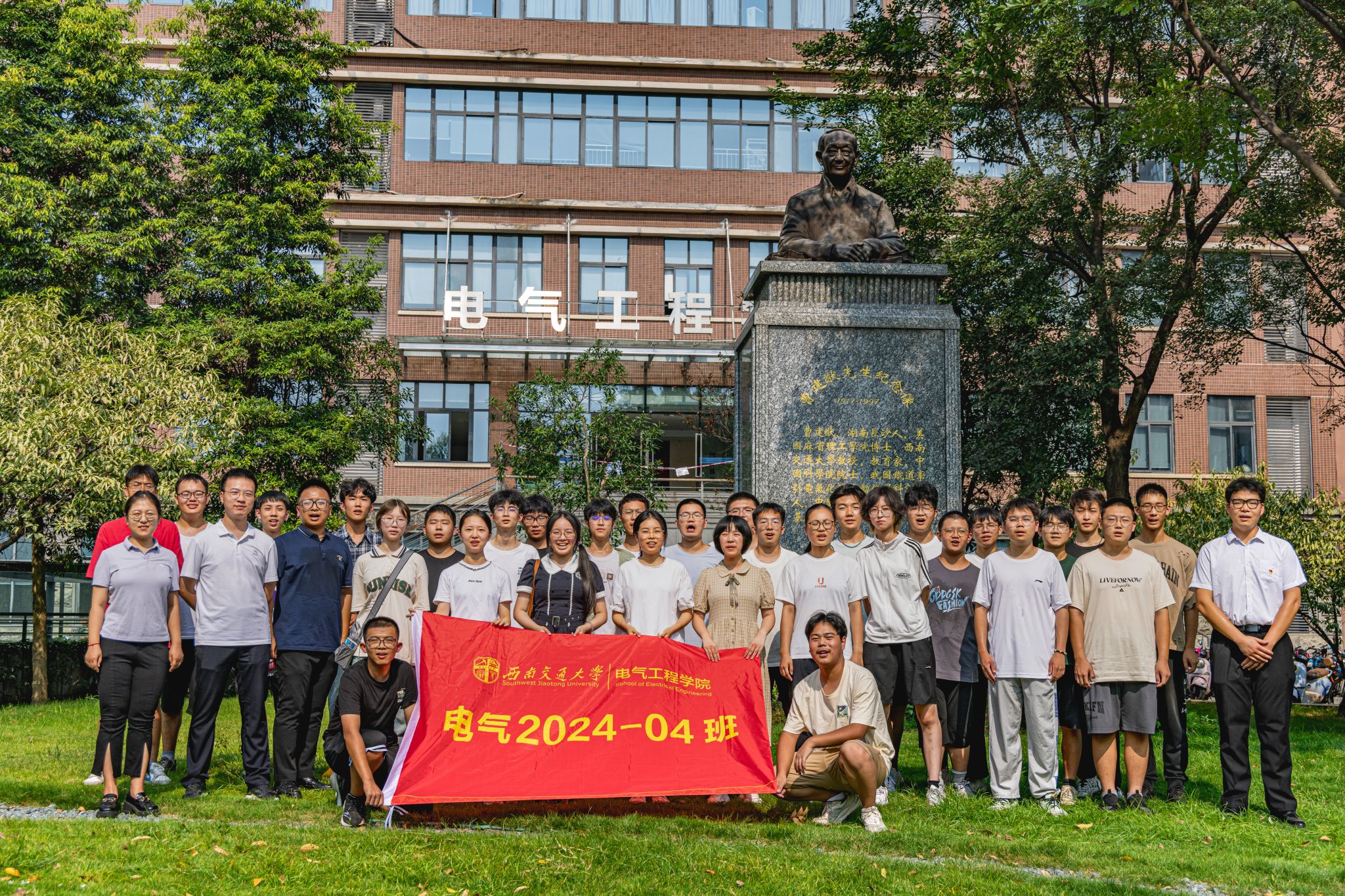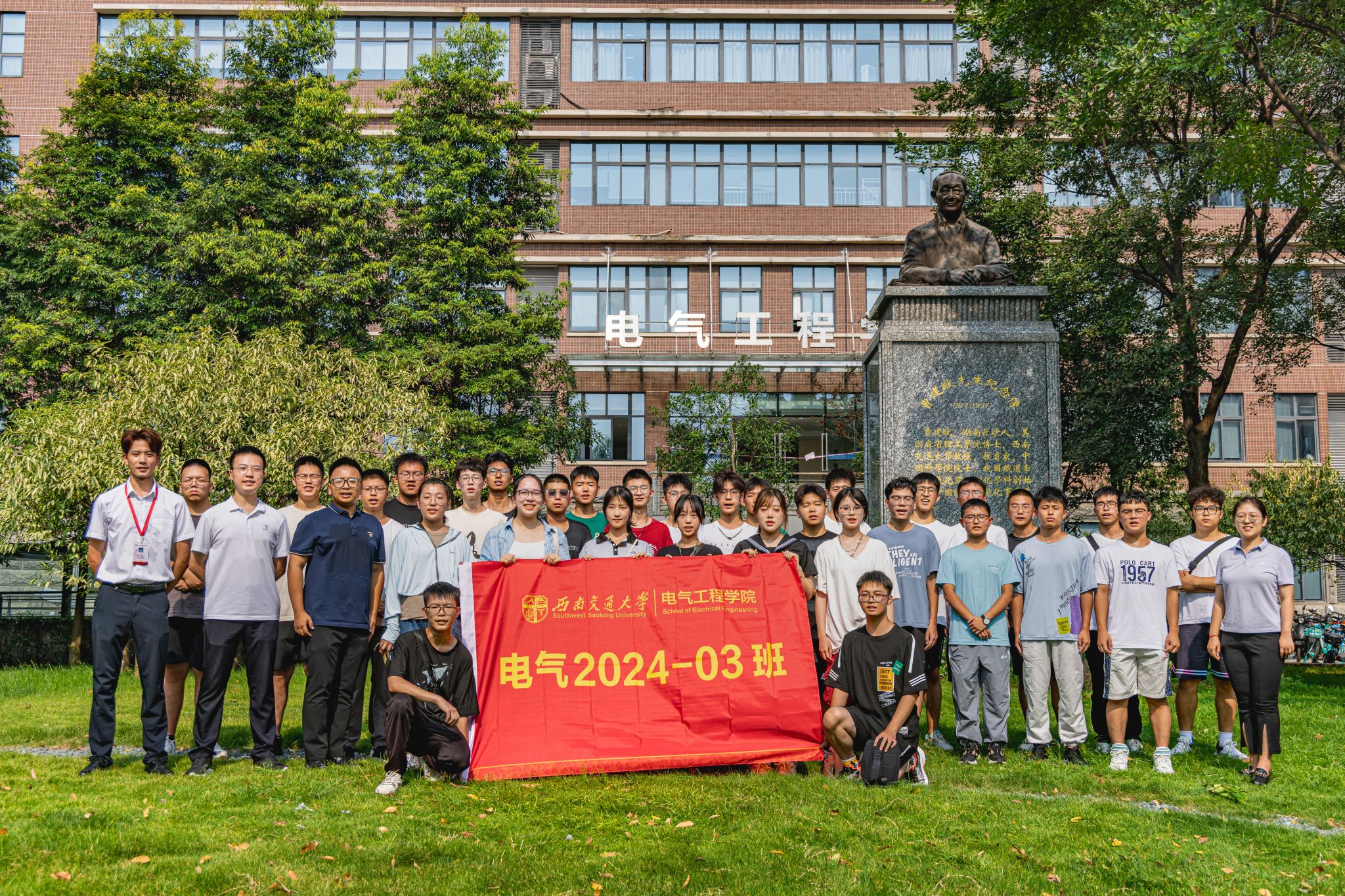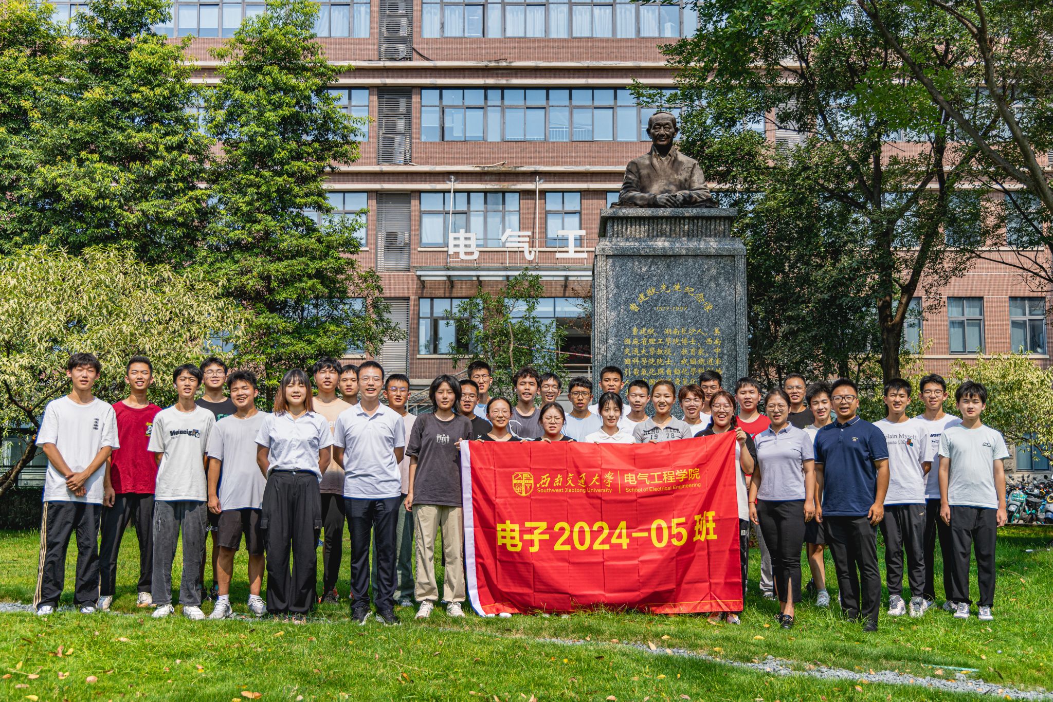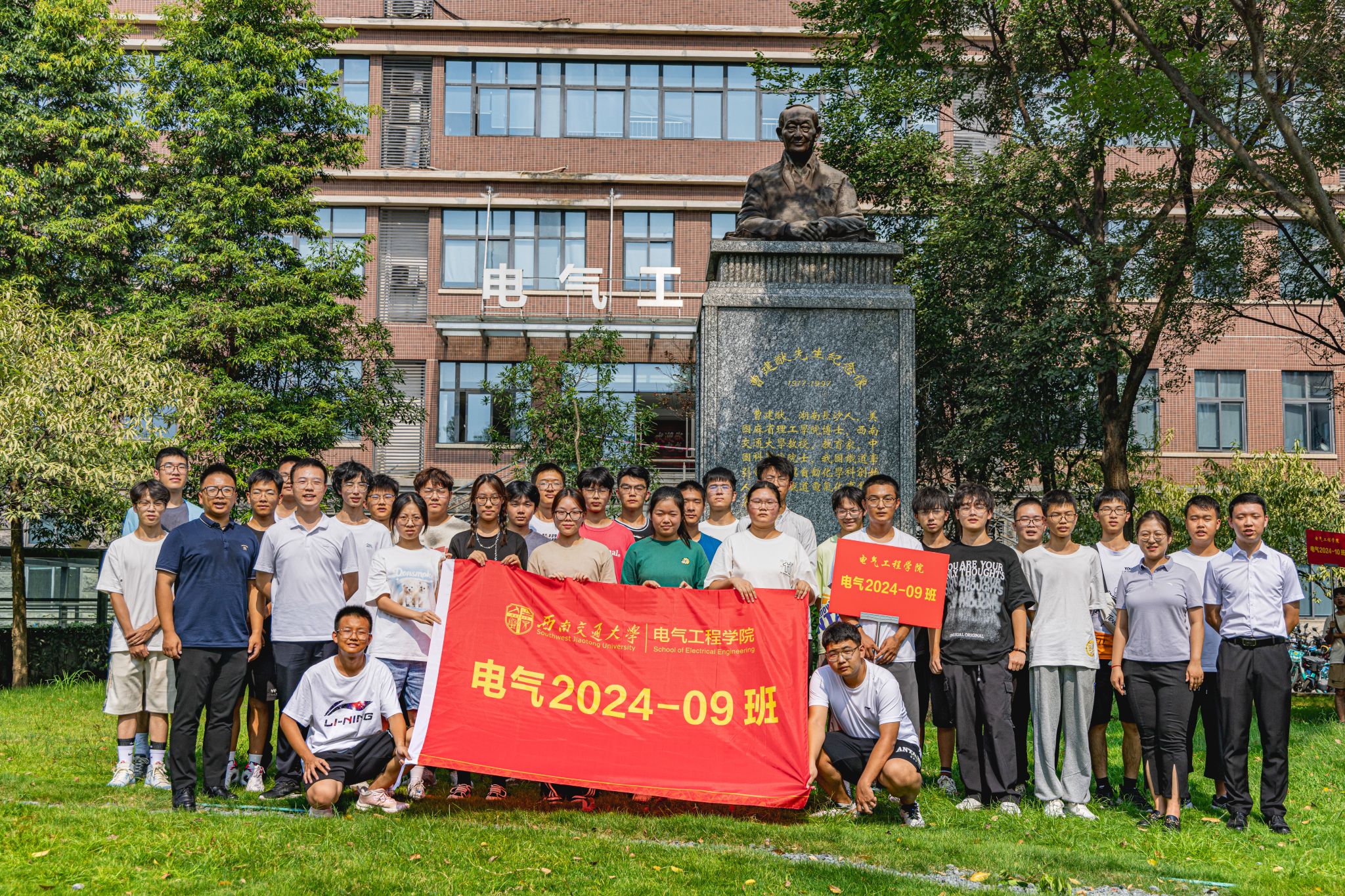 9月3日下午15时,公司2024级本科新生在辅导员老师以及辅导员助理的带领下来到电气馆,并在曹建猷院士铜像前进行班级合影。