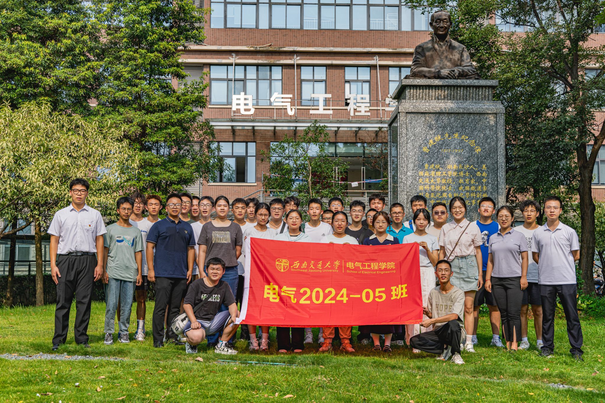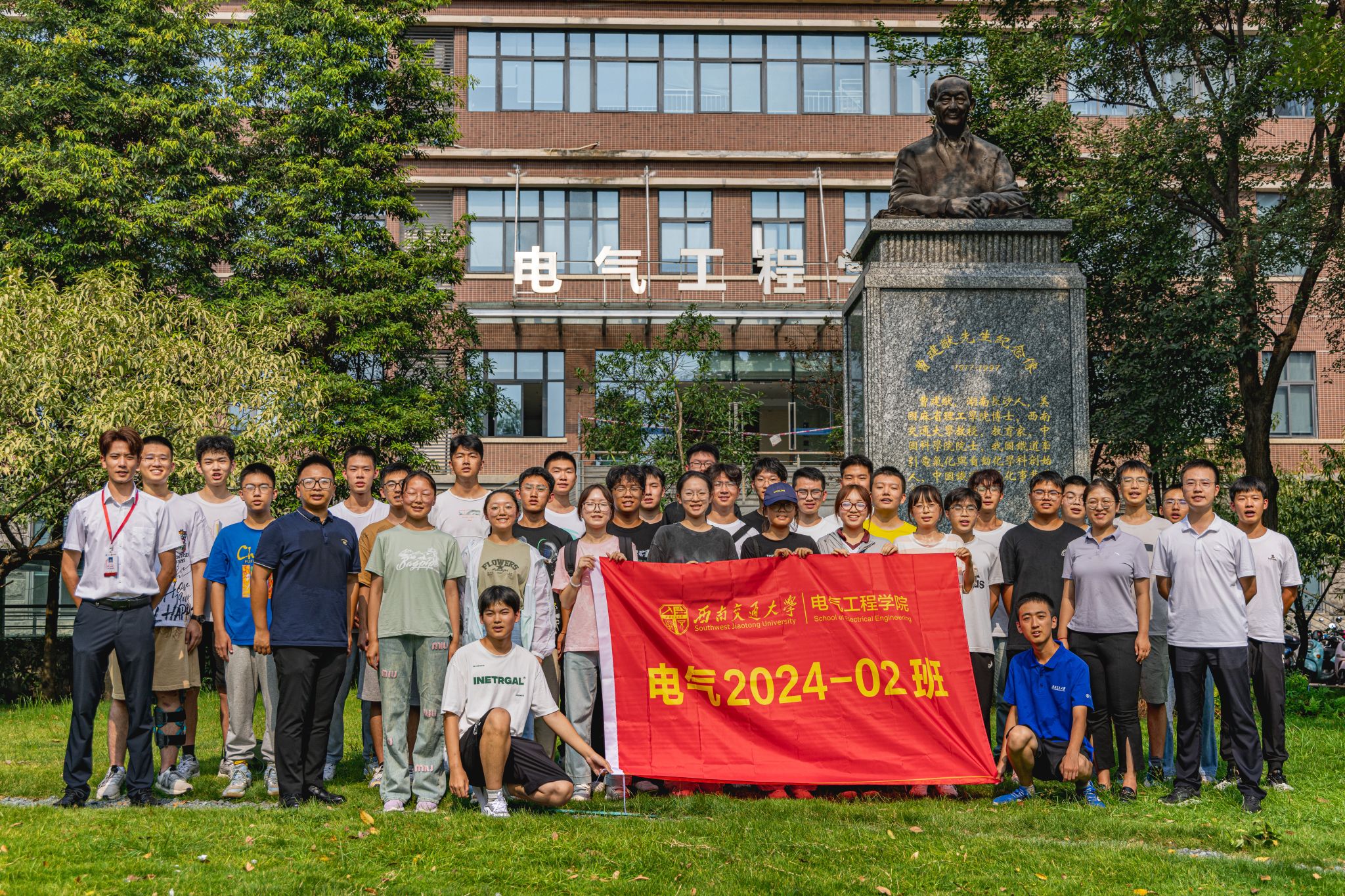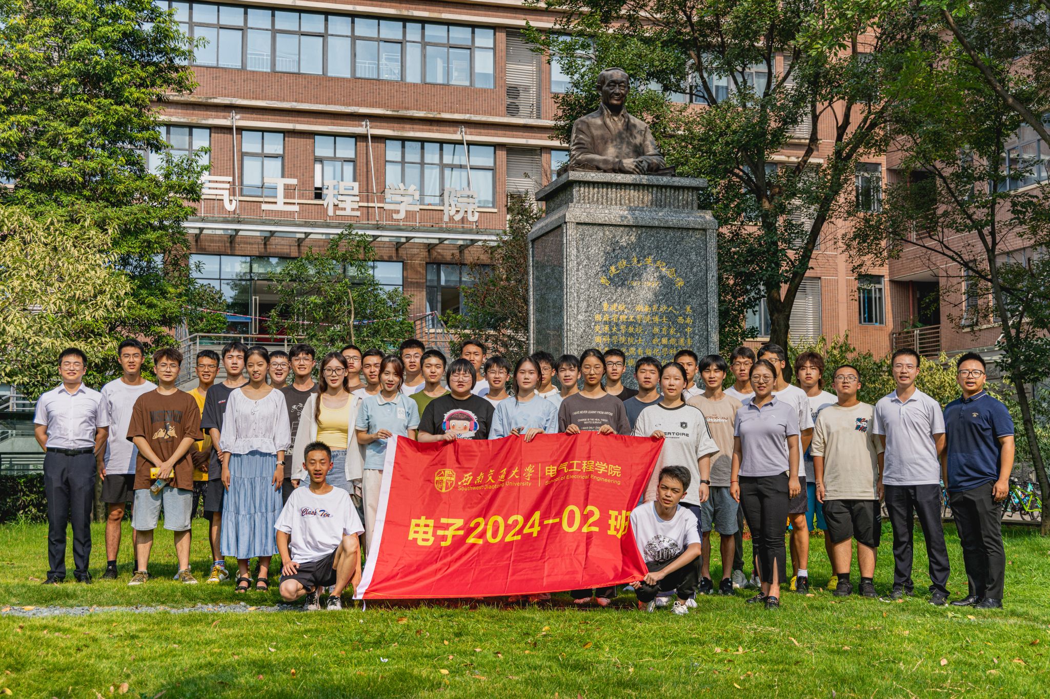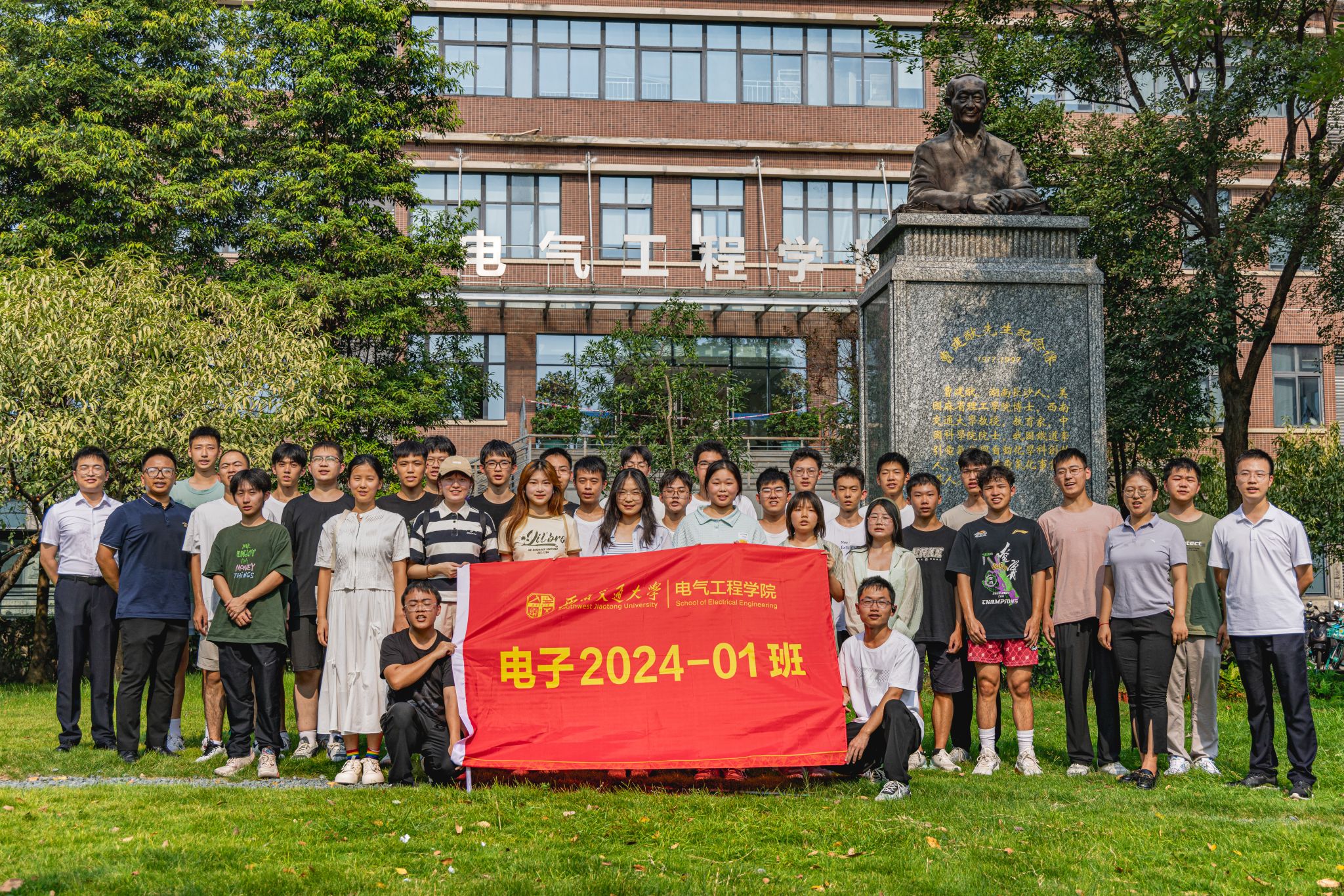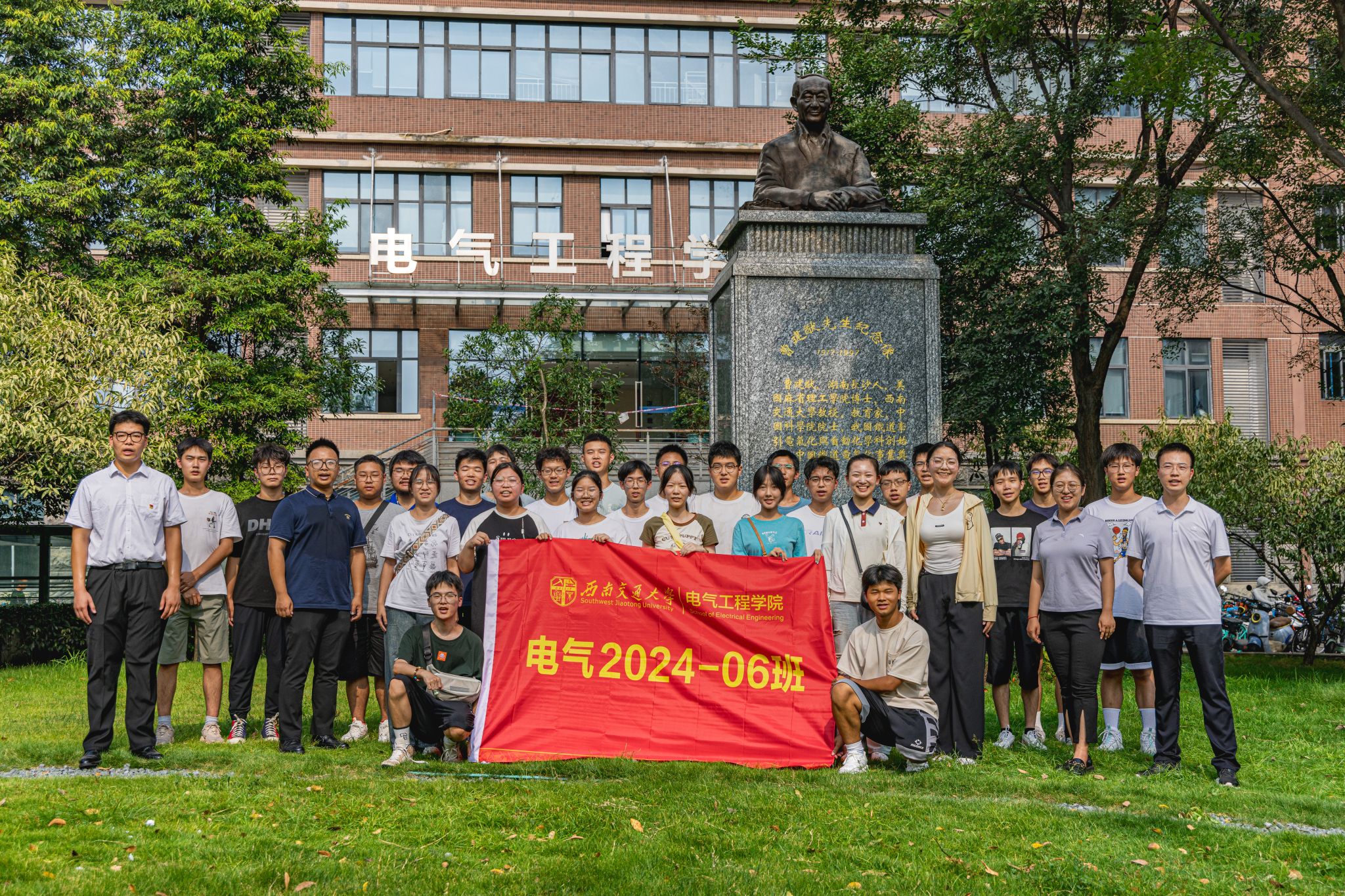 9月3日下午15时,公司2024级本科新生在辅导员老师以及辅导员助理的带领下来到电气馆,并在曹建猷院士铜像前进行班级合影。