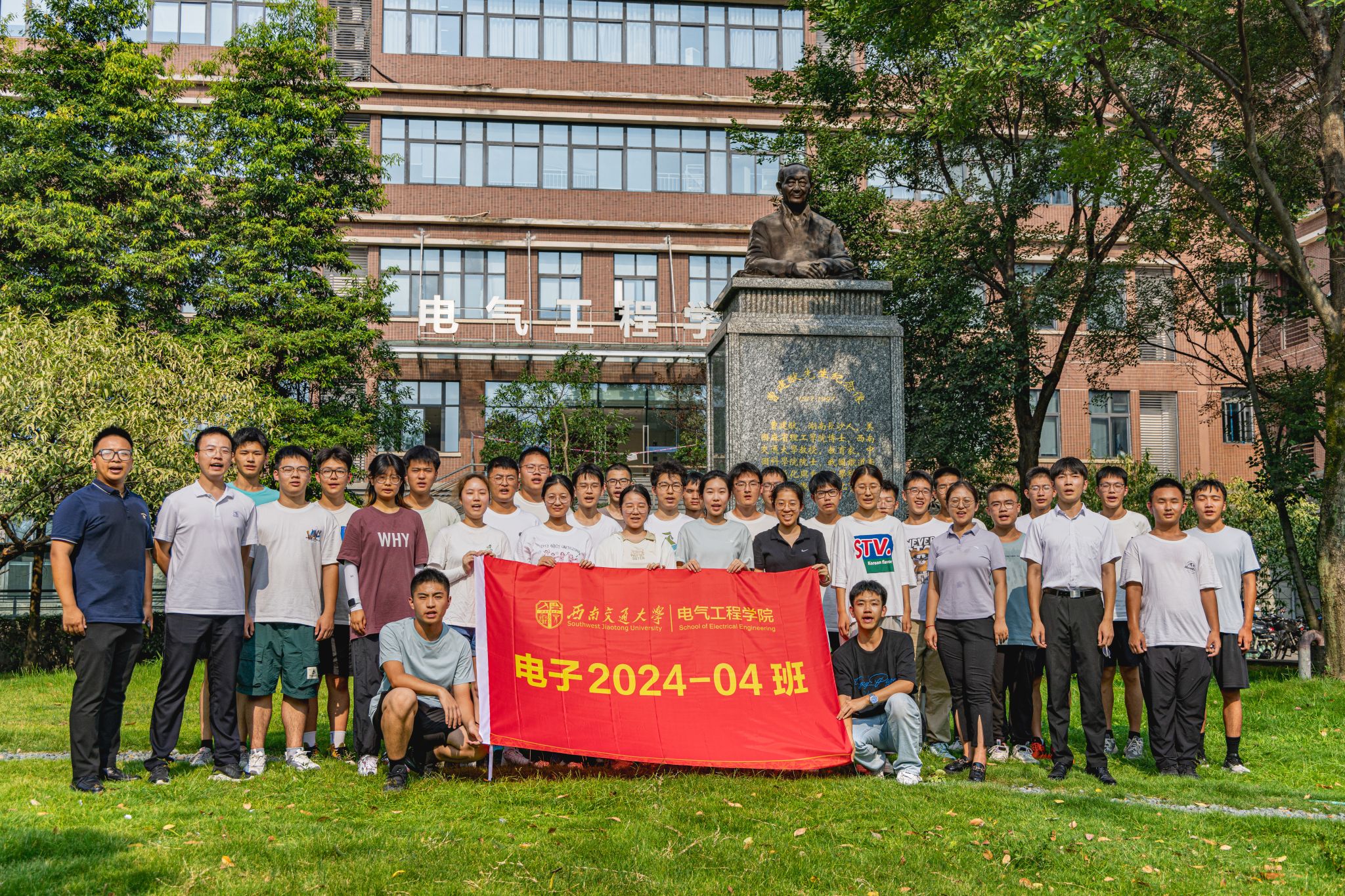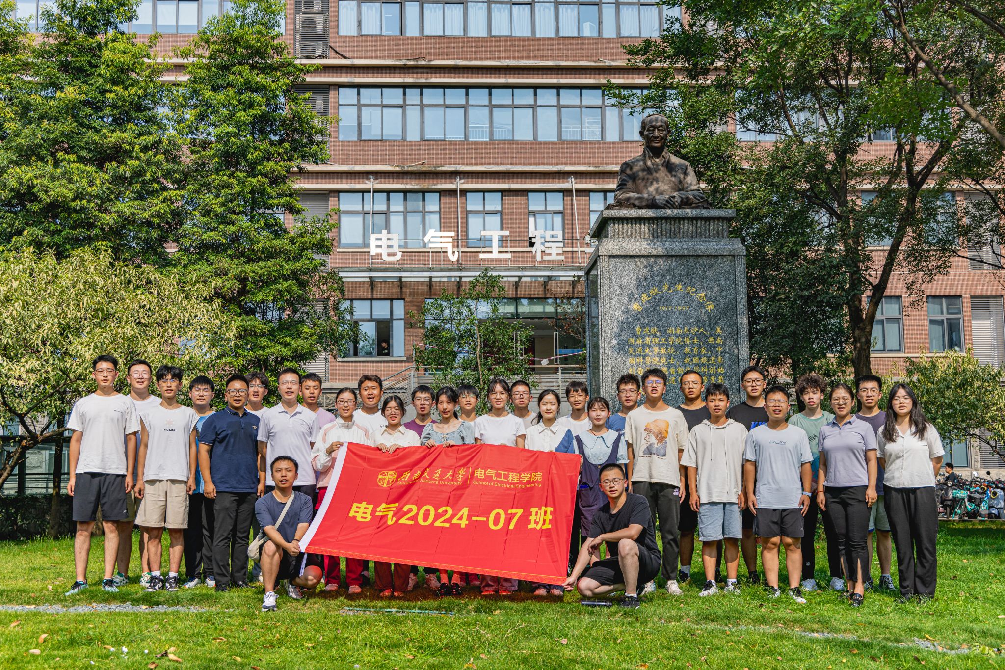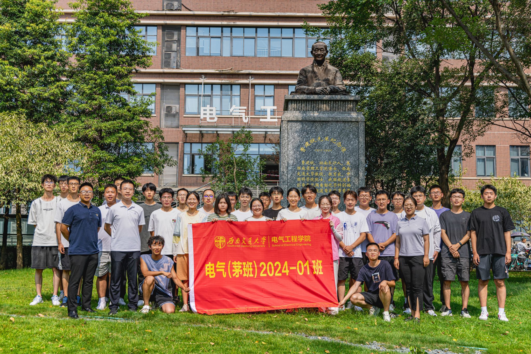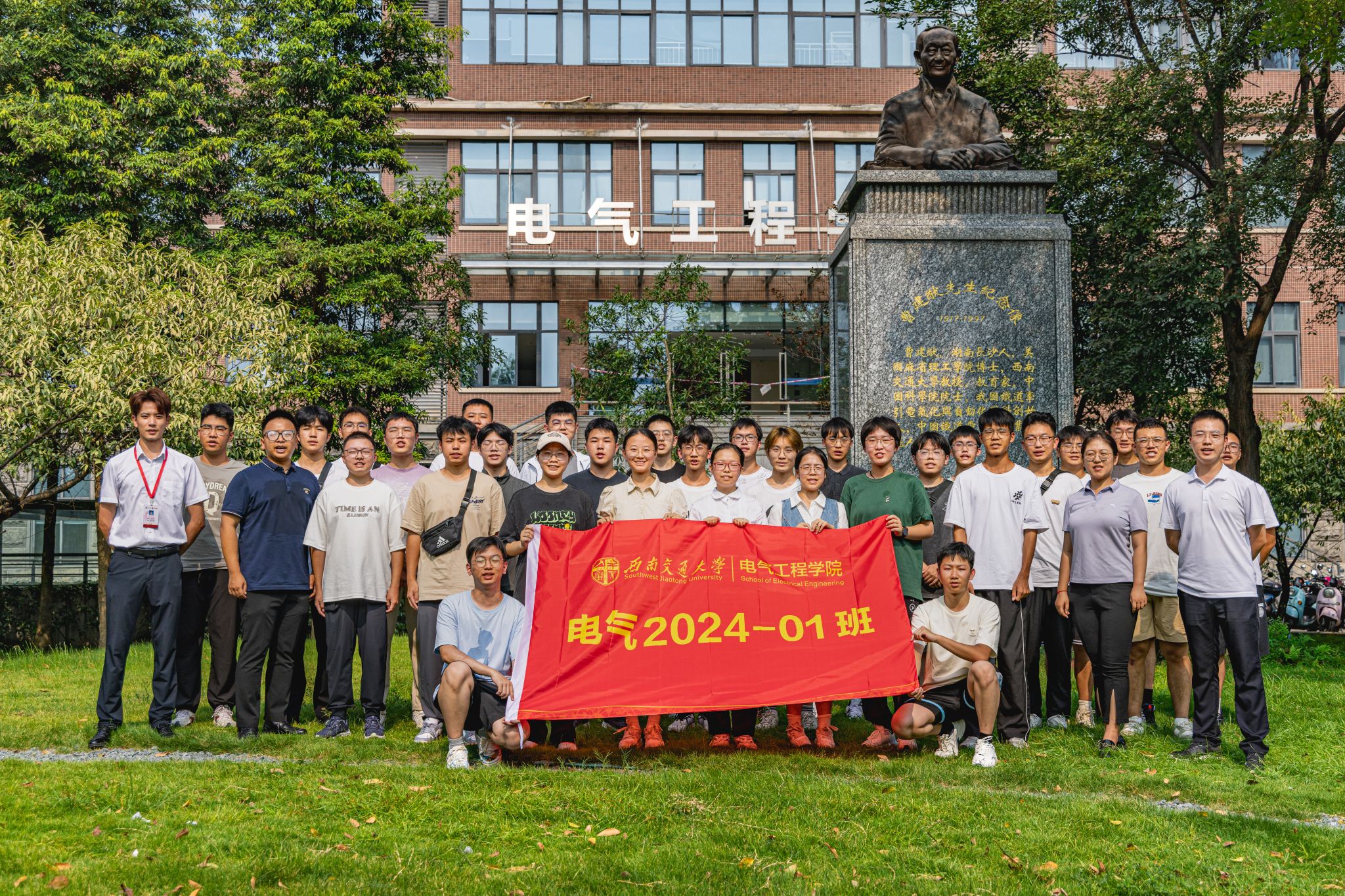 9月3日下午15时,公司2024级本科新生在辅导员老师以及辅导员助理的带领下来到电气馆,并在曹建猷院士铜像前进行班级合影。