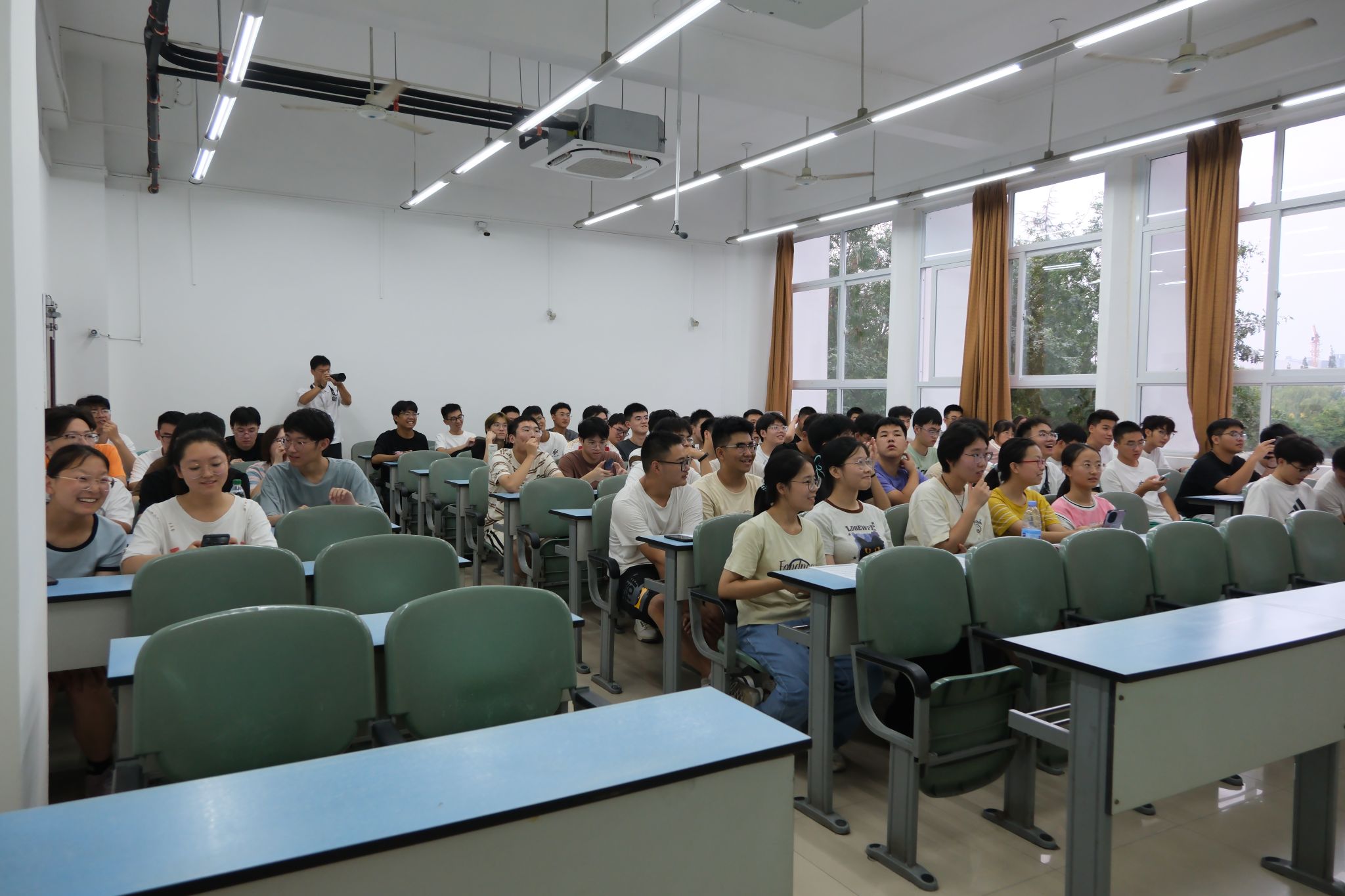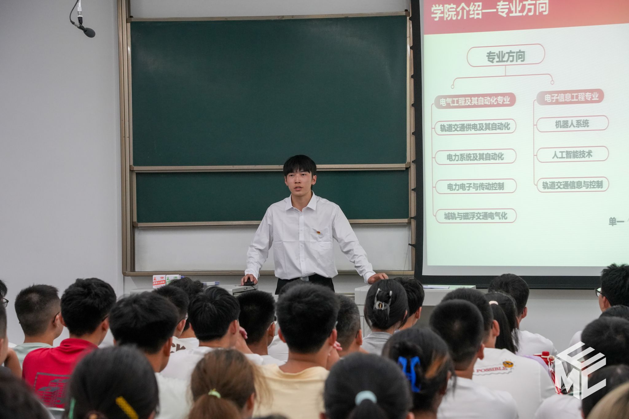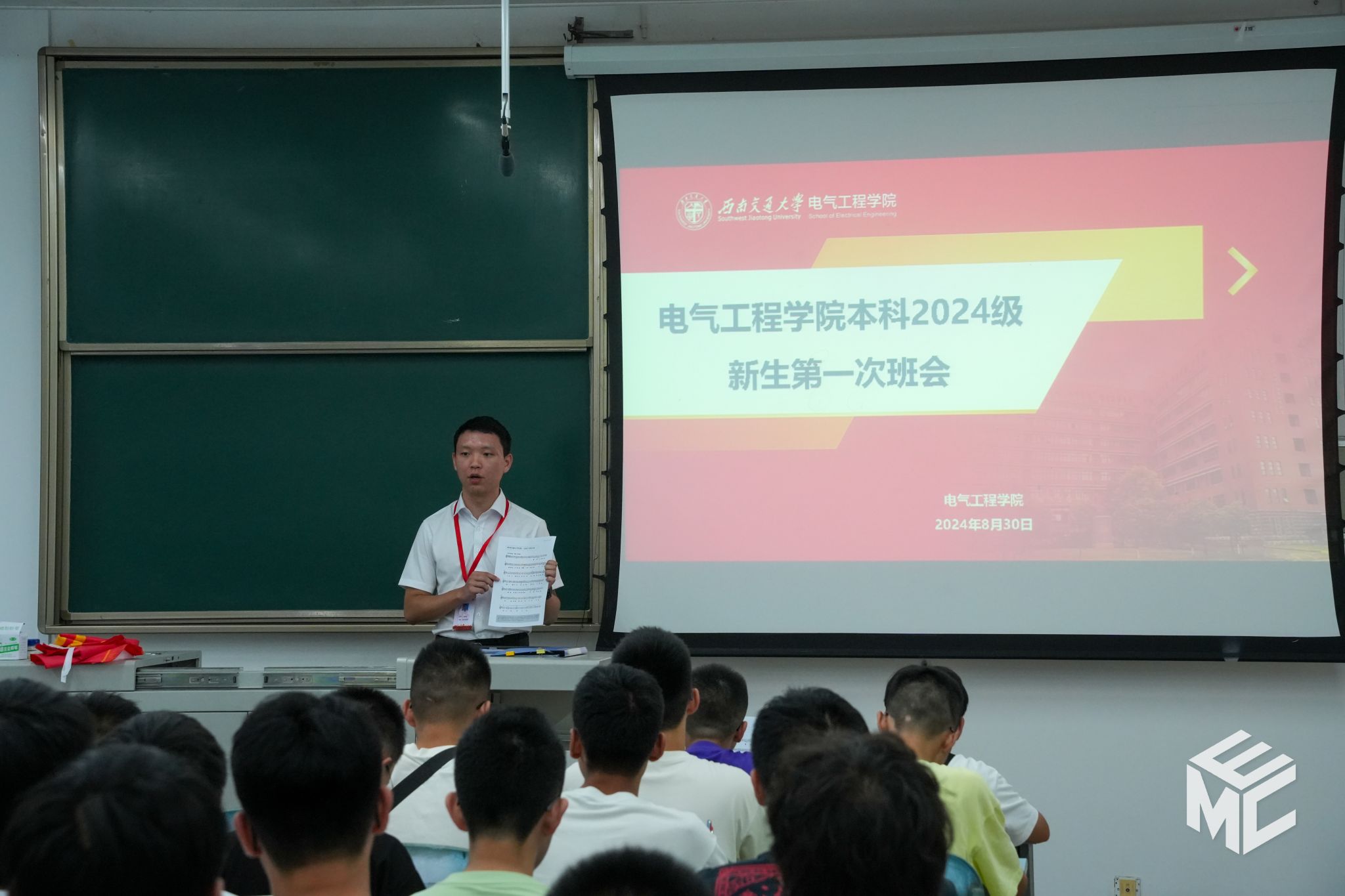 本科2024级新生在辅导员助理的带领下唱响校歌,用雄壮、嘹亮的歌声开启新生第一次班会。